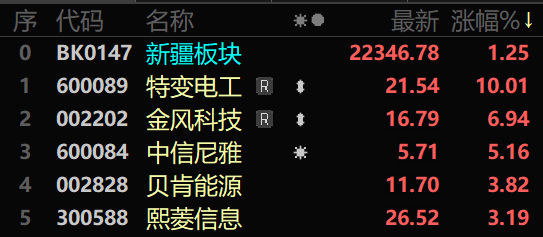 今日,特變電工上漲10.01%,報(bào)收21.54元;金風(fēng)科技上漲6.94%,報(bào)收16.79元;中信尼雅上漲5.16%,報(bào)收5.71元;貝肯能源上漲3.82%,報(bào)收11.70元;熙菱信息上漲3.19%,報(bào)收26.52元。天富能源、新疆交建、寶地礦業(yè)、德新科技、中油資本跌幅居前。