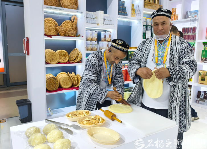 11月5日,新疆展商在新疆館展示馕制作過程。