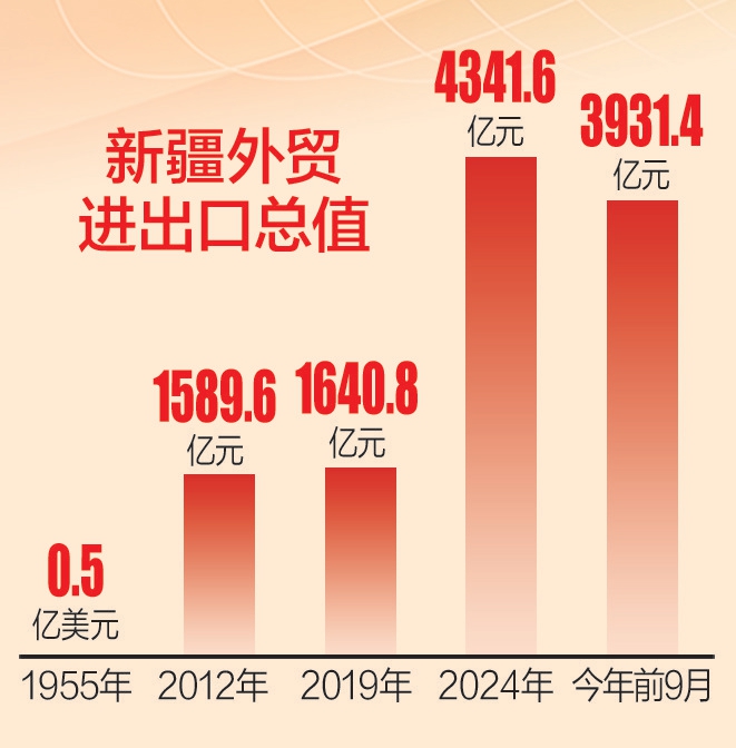 三寶集團(tuán)發(fā)展提速的背后,是新疆外貿(mào)的跨越式增長(zhǎng)——從2012年1589.6億元到2024年的4341.6億元。特別是2022年到2024年,新疆外貿(mào)額連續(xù)突破2000億元、3000億元、4000億元,連續(xù)3年跨越了3個(gè)千億元臺(tái)階。