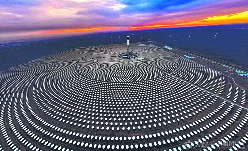 俯瞰位于伊吾縣淖毛湖鎮(zhèn)的中國能建哈密熔鹽塔式5萬千瓦光熱發(fā)電站(11月10日無人機攝)。該電站設(shè)計年均發(fā)電量約2億千瓦時,可滿足6.19萬戶家庭全年用電需求,每年可減少二氧化碳排放15.48萬噸。馬新亮 攝