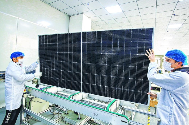 11月12日,位于疏勒縣高新技術(shù)產(chǎn)業(yè)孵化園的新疆新碳藍都能源科技有限公司員工搬運太陽能電池板組件。該公司是一家集研發(fā)、制造、銷售為一體的新能源企業(yè)。陳軍強 攝