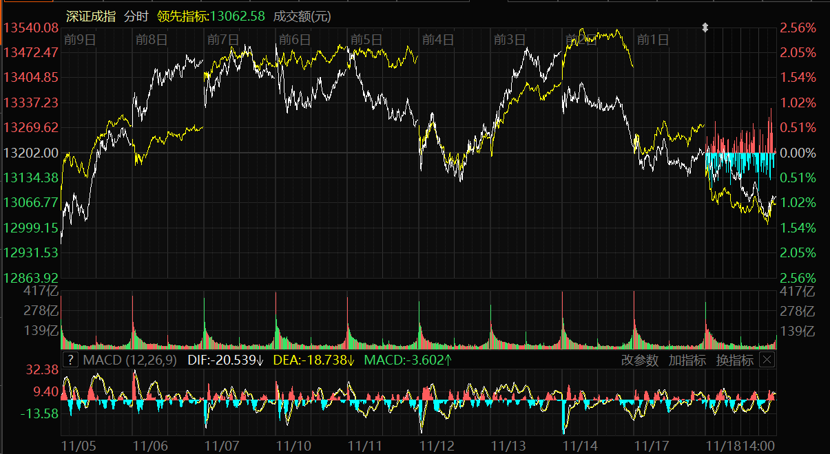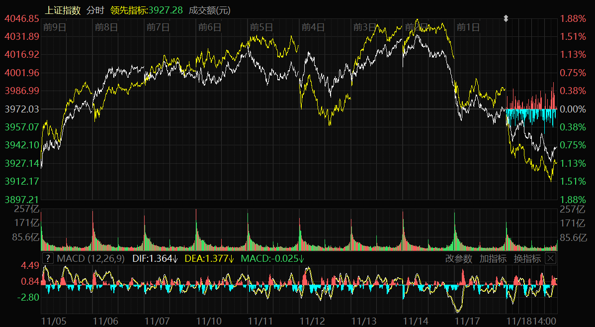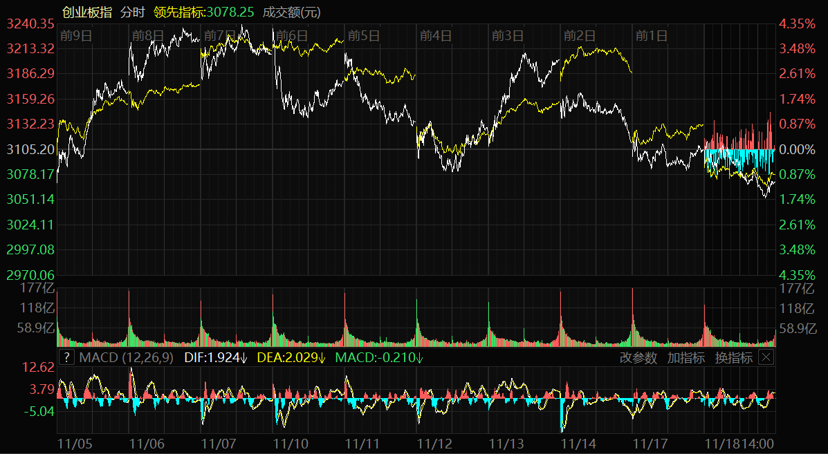 天山網(wǎng)-新疆日?qǐng)?bào)訊(記者冉虎報(bào)道)11月18日,A股三大指數(shù)集體回調(diào),上證指數(shù)日K線呈三連陰走勢(shì)。截至收盤,上證指數(shù)跌0.81%,報(bào)收3939.81點(diǎn);深證成指跌0.92%,報(bào)收13080.49點(diǎn);創(chuàng)業(yè)板指跌1.16%,報(bào)收3069.22點(diǎn)。滬深兩市成交額19261億元,較昨日小幅放量153億元。