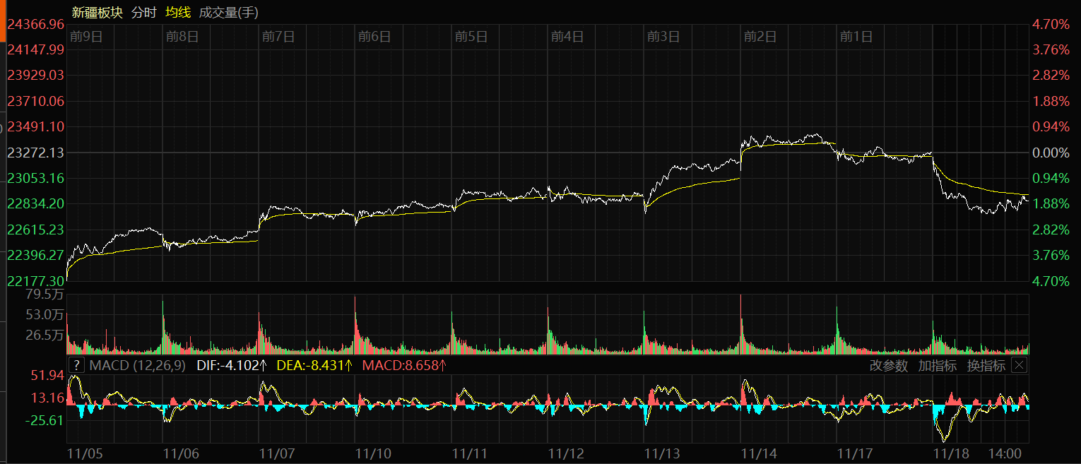 11月18日收盤時(shí),新疆板塊指數(shù)跌1.80%,報(bào)收22852.96點(diǎn),7只股票上漲,54只股票下跌,個(gè)股上漲比例為11.48%,總換手率1.82%,總成交額209.51億元。
