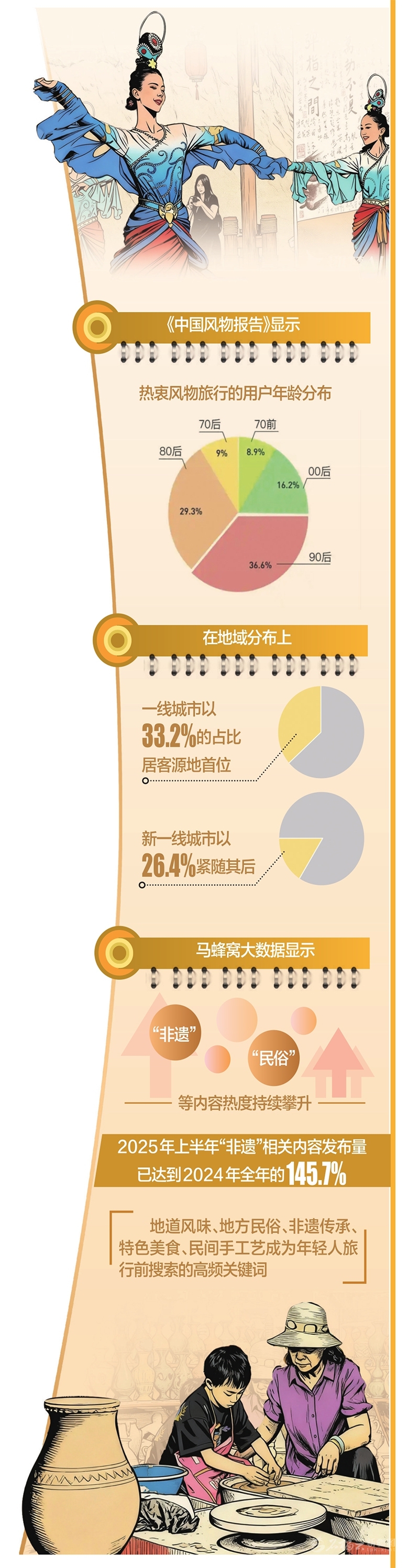 《中國風物報告》顯示,游客已過了“看山看水”的階段,開始追尋各地的文化之美和生活之趣。王曉雪介紹,90后以36.6%的占比成為風物旅行主力,80后以29.3%緊隨其后,00后則以16.2%的占比顯示出巨大潛力。
