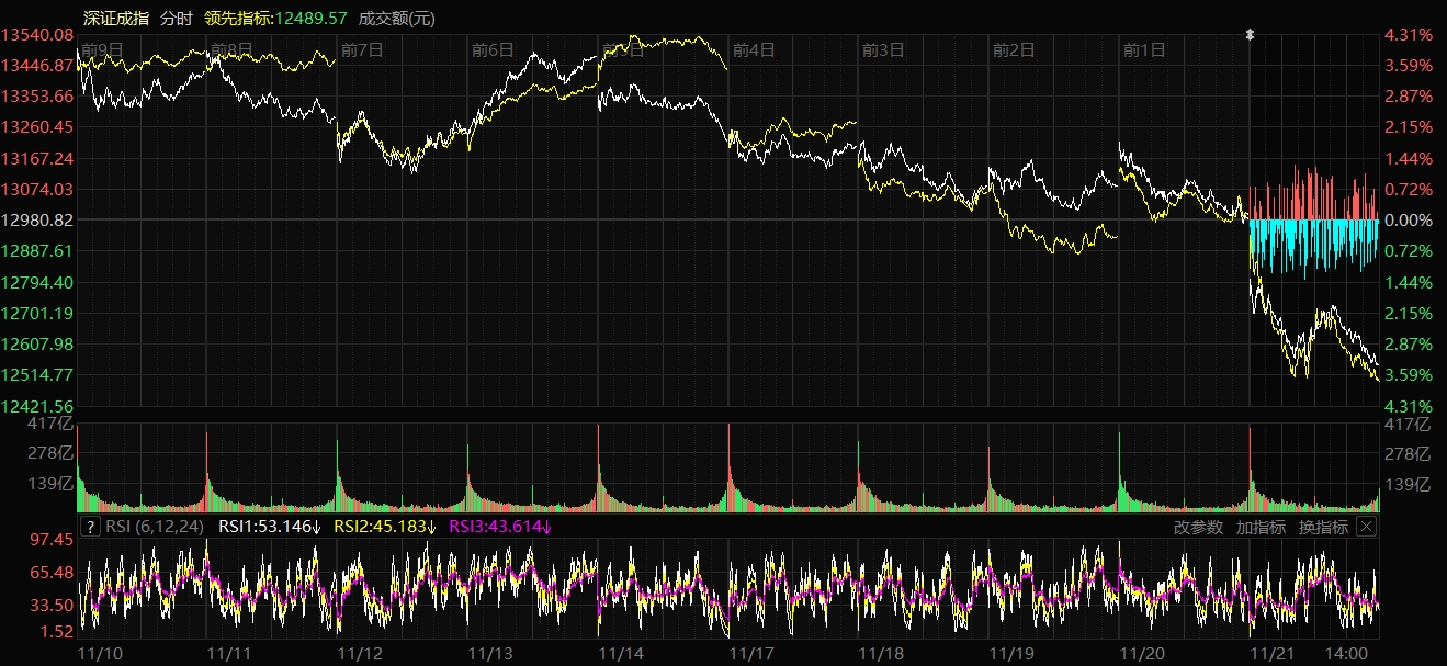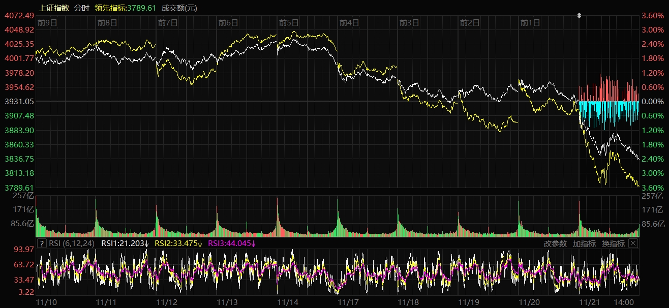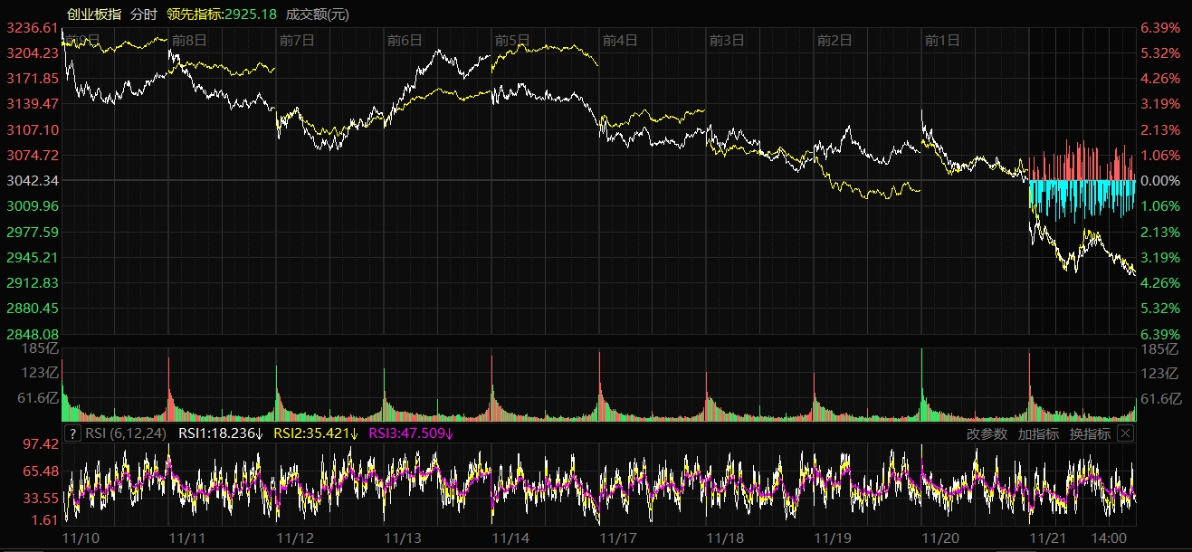 天山網(wǎng)-新疆日報訊(記者趙悅報道)11月21日,A股三大指數(shù)集體重挫。截至收盤,上證指數(shù)跌2.45%,報收3834.89點;深證成指跌3.41%,報收12538.07點;創(chuàng)業(yè)板指數(shù)跌4.02%,報收2920.08點。滬深兩市成交額19657億元,較昨日放量2575億元。