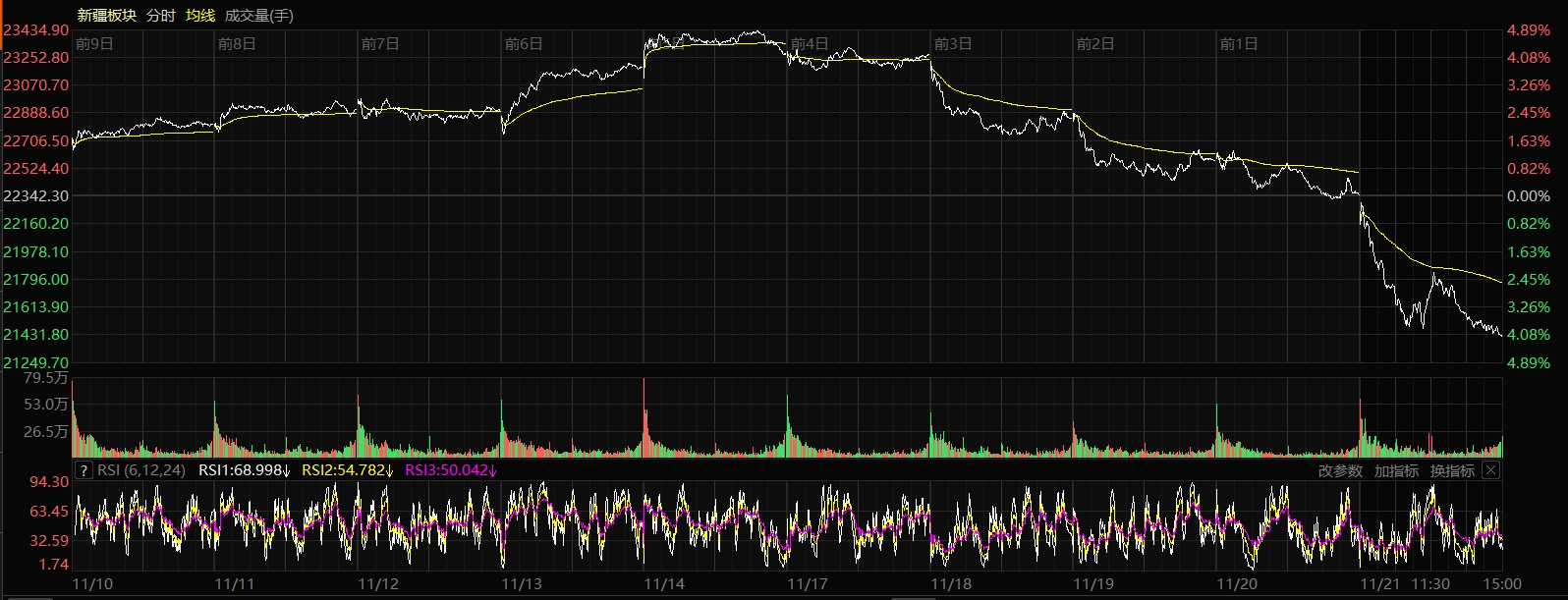 11月21日收盤時,新疆板塊指數(shù)跌4.17%,報收21410.89點,1只股票上漲,60只股票下跌,個股上漲比例為1.64%,總換手率2.09%,總成交額228.28億元。