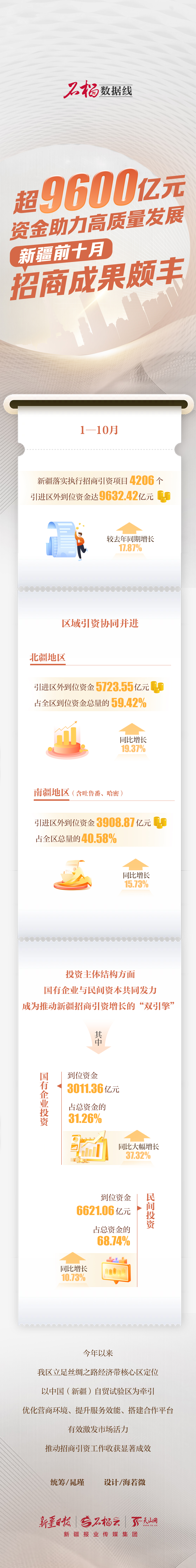 1—10月,新疆招商引資工作交出亮眼答卷,全區(qū)落實執(zhí)行招商引資項目4206個,引進區(qū)外到位資金達(dá)9632.42億元,較去年同期增長17.87%,持續(xù)保持穩(wěn)中有進、量質(zhì)齊升的良好發(fā)展態(tài)勢。