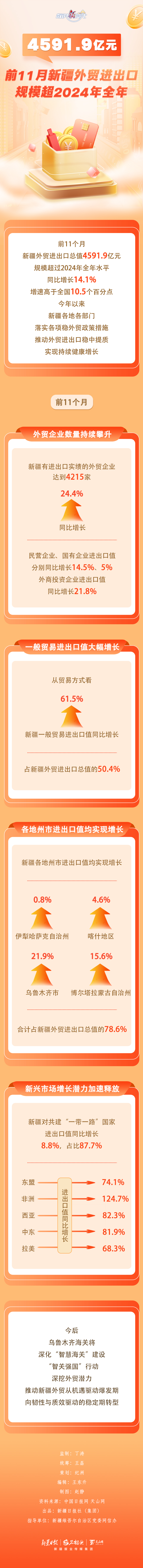 2025年前11個月,新疆外貿(mào)進出口總值達4591.9億元,規(guī)模超過2024年全年水平。新疆各類企業(yè)進出口值增長情況如何?各地州市外貿(mào)進出口表現(xiàn)怎樣?今天的《數(shù)說“新”變化》一起來看看。