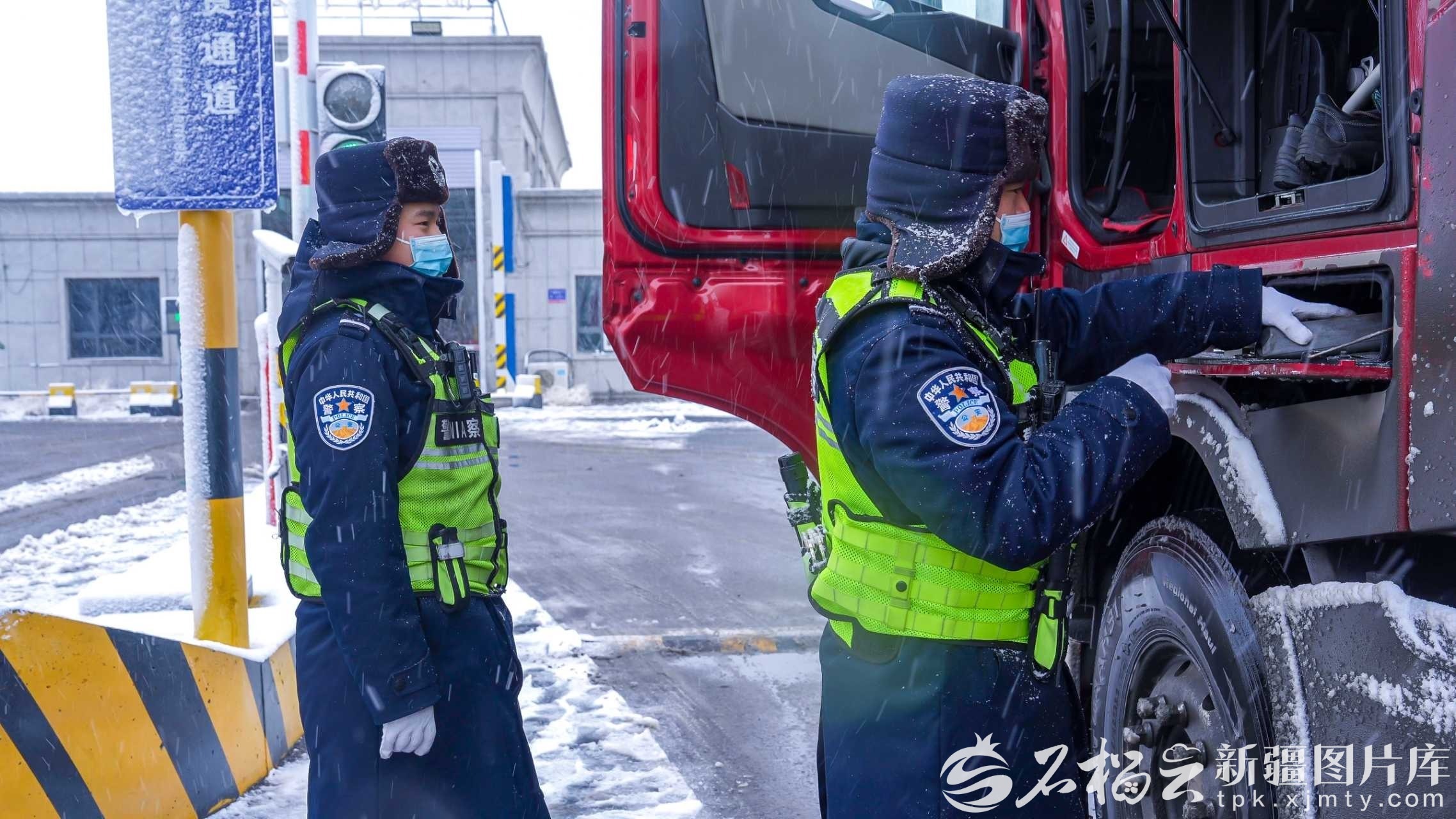 12月20日,都拉塔出入境邊防檢查站執(zhí)勤民警在風雪中對貨車進行查驗。韓朱玉格 攝