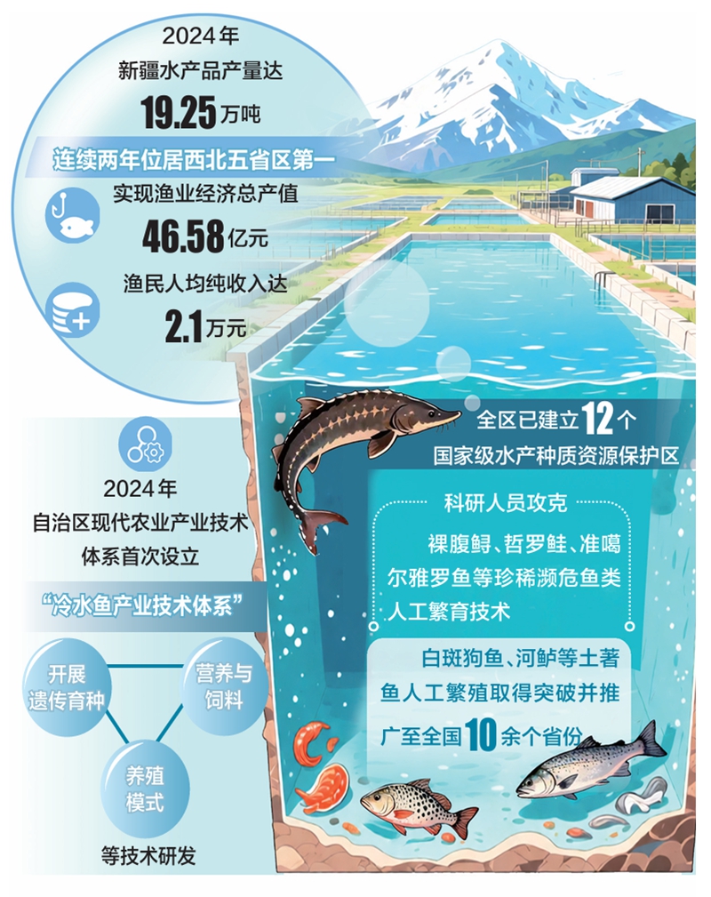 從高山湖泊到盆地邊緣、從凜冽的雪融水到深埋于沙漠的苦咸水,遠離海洋的新疆,以科技為翼、生態(tài)為基、產(chǎn)業(yè)為脈,突破地理資源限制,探索出一條陸地漁業(yè)高質(zhì)量發(fā)展的新路,將漁業(yè)豐收特有的藍色,描繪進現(xiàn)代農(nóng)業(yè)的豐收畫卷。