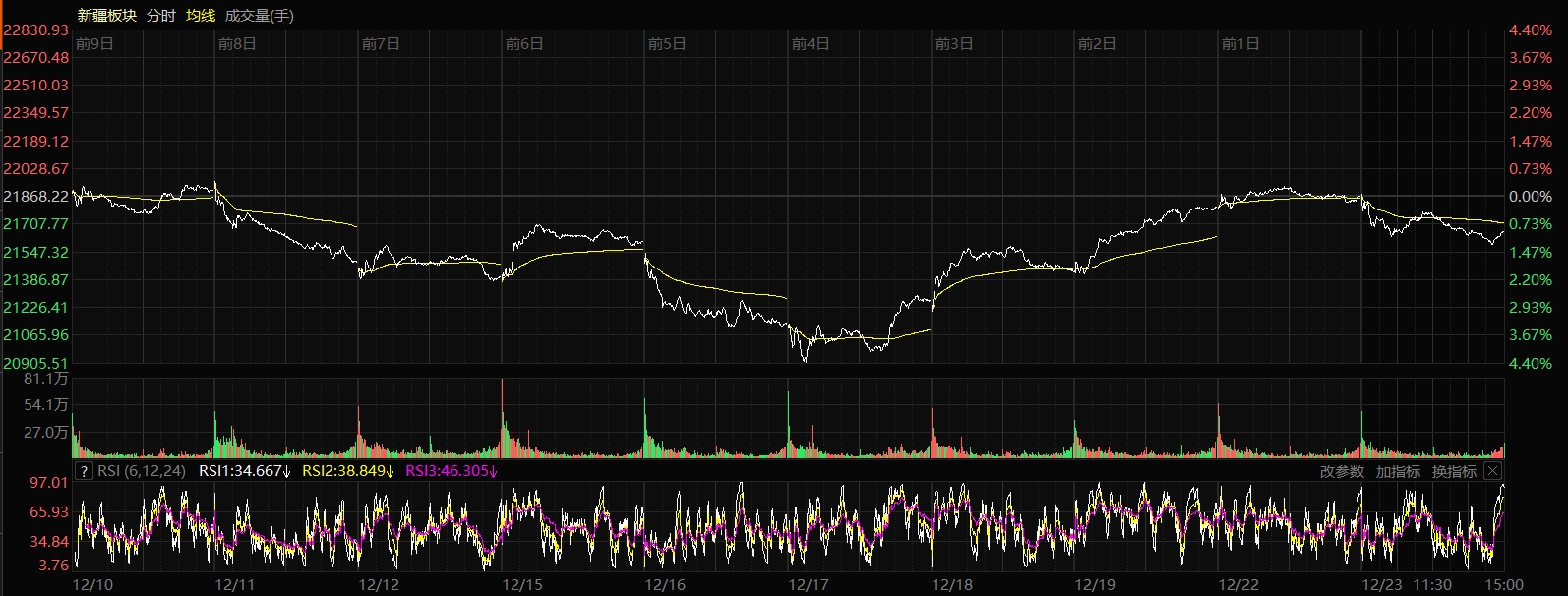 12月23日收盤時(shí),新疆板塊指數(shù)跌0.93%,報(bào)收21663.82點(diǎn),13只股票上漲,46只股票下跌,2只股票平盤,個(gè)股上漲比例為21.31%,總換手率1.30%,總成交額165.10億元。