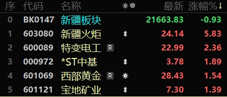 其中,新疆火炬上漲5.83%,報(bào)收24.14元;特變電工上漲2.36%,報(bào)收22.99元;*ST中基上漲1.89%,報(bào)收3.78元;西部黃金上漲1.54%,報(bào)收28.43元;寶地礦業(yè)上漲1.39%,報(bào)收7.30元。博納影業(yè)、匯嘉時(shí)代、麥趣爾、天順股份、科力股份跌幅居前。