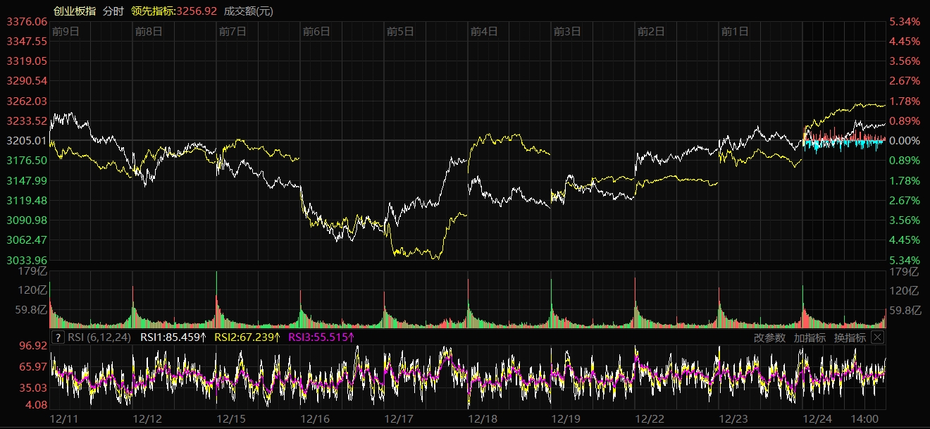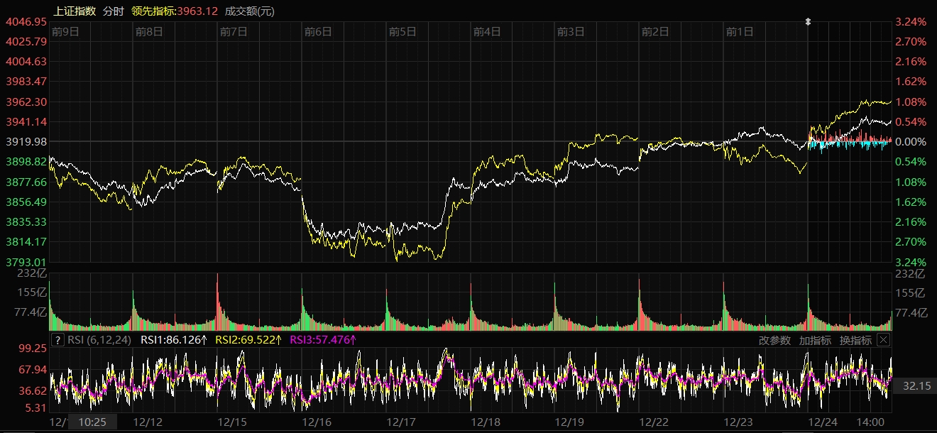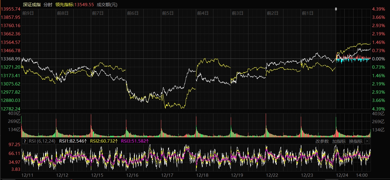 天山網(wǎng)-新疆日報訊(記者趙悅報道)12月24日,A股三大指數(shù)集體上漲,滬指日線六連陽。截至收盤,滬指漲0.53%,收報3940.95點;深證成指漲0.88%,收報13486.42點;創(chuàng)業(yè)板指漲0.77%,收報3229.58點。滬深兩市成交額接近18803億元,較昨日小幅縮量196億元。
