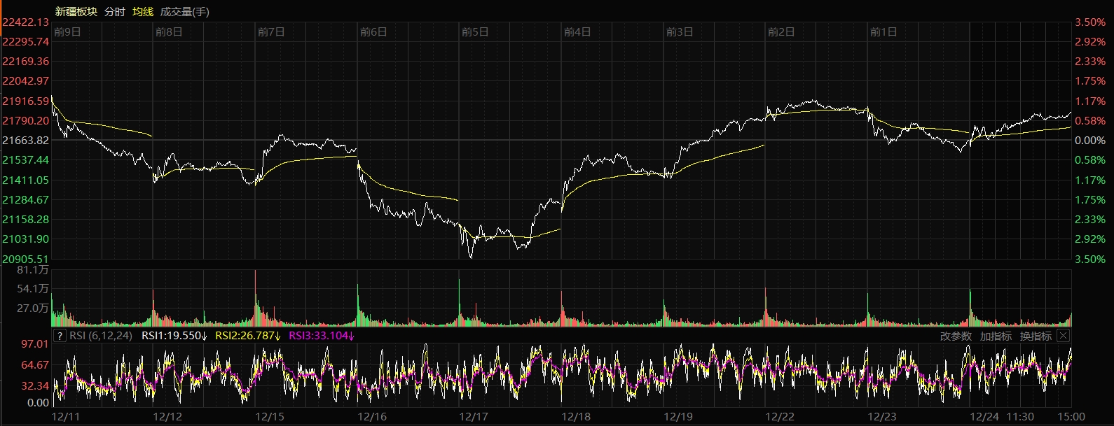 12月24日收盤時,新疆板塊指數(shù)漲0.82%,報收21841.92點,46只股票上漲,13只股票下跌,3只股票平盤,個股上漲比例為74.19%,總換手率1.48%,總成交額176.55億元。