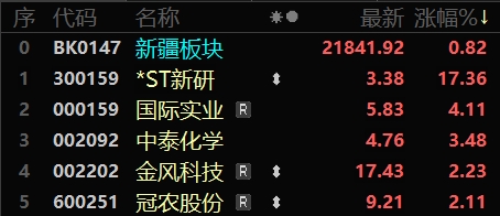 其中,*ST新研上漲17.36%,報收3.38元;國際實業(yè)上漲4.11%,報收5.83元;中泰化學上漲3.48%,報收4.76元;金風科技上漲2.23%,報收17.43元;冠農(nóng)股份上漲2.11%,報收9.21元。西部黃金、新疆火炬、西部牧業(yè)、天康生物、百花醫(yī)藥跌幅居前。