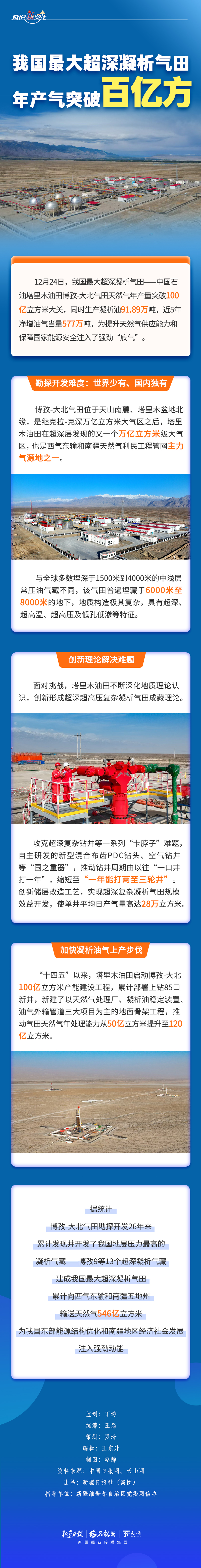 2025年12月24日,我國最大超深凝析氣田——中國石油塔里木油田博孜-大北氣田天然氣年產量突破100億立方米大關,同時生產凝析油91.89萬噸,近5年凈增油氣當量577萬噸,為提升天然氣供應能力和保障國家能源安全注入了強勁“底氣”。面對超深、超高溫、超高壓等世界級勘探開發(fā)難題,博孜-大北氣田是如何實現高效開發(fā)的?背后又凝聚了哪些技術與管理的突破?本期《數說“新”變化》為您解析。