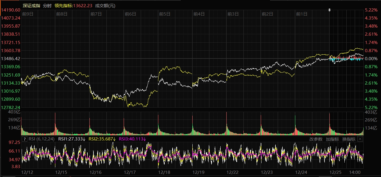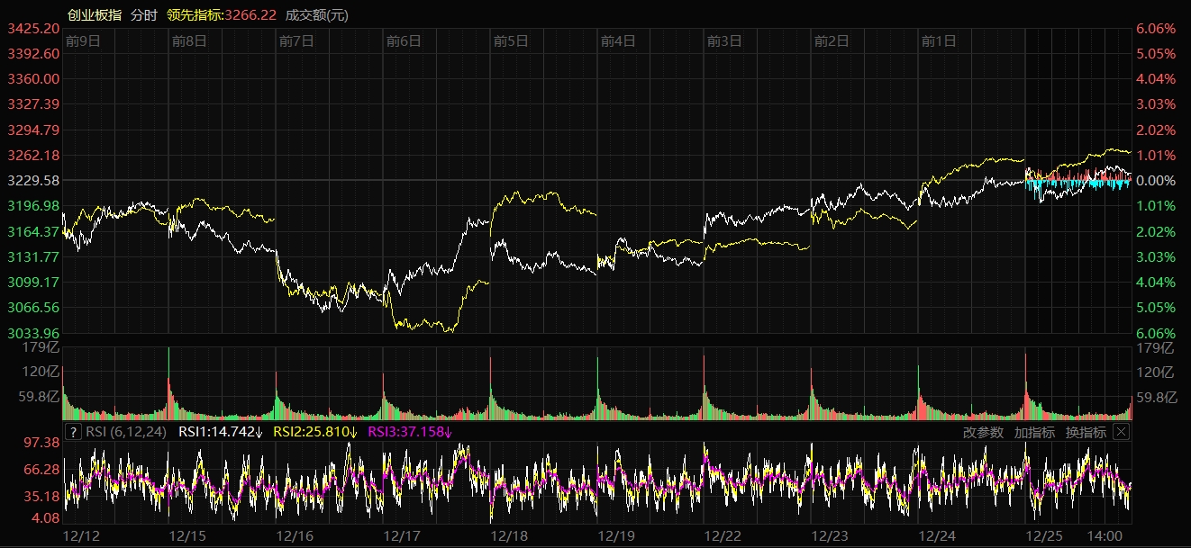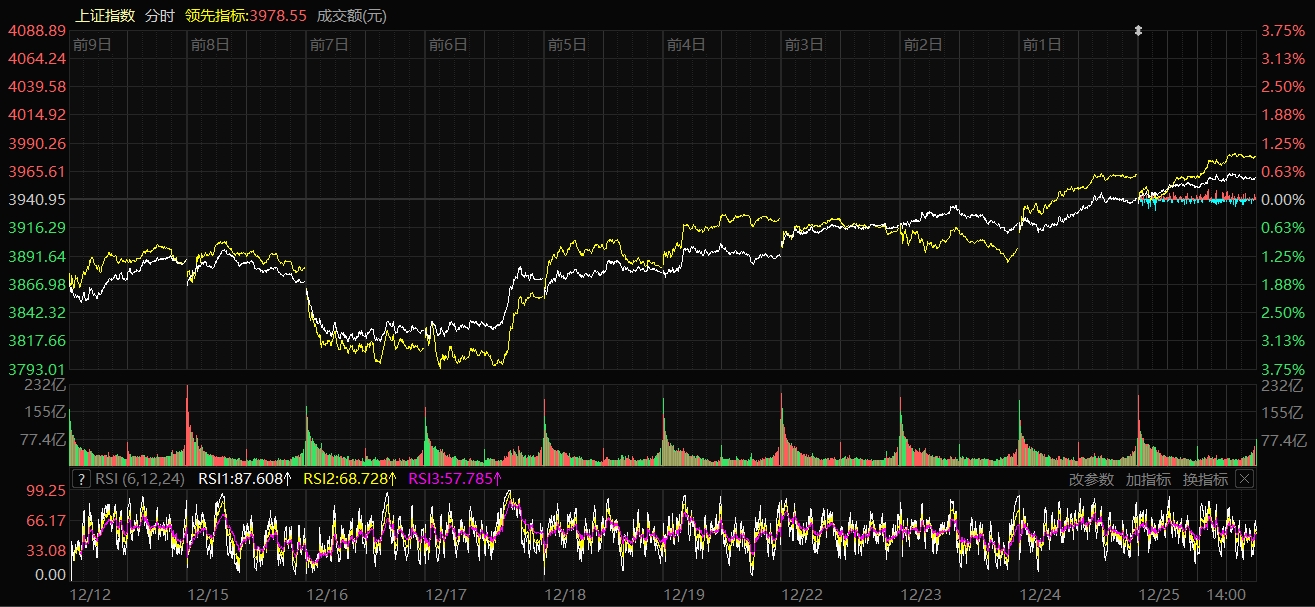 天山網-新疆日報訊(記者趙悅報道)12月25日,A股三大指數(shù)小幅上揚,滬指日線七連陽。截至收盤,滬指漲0.47%,收報3959.62點;深證成指漲0.33%,收報13531.41點;創(chuàng)業(yè)板指漲0.30%,收報3239.34點。滬深兩市成交額達到19245億元,較昨日放量443億元。