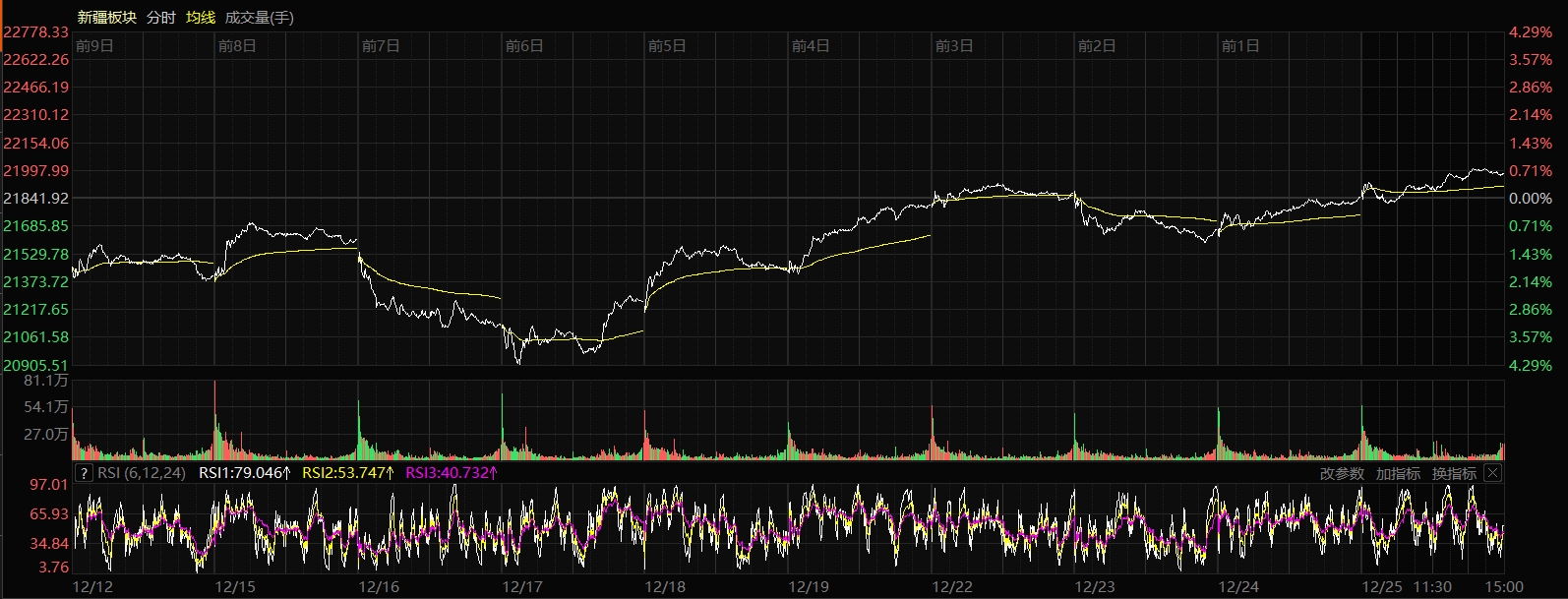 12月25日收盤時,新疆板塊指數(shù)漲0.63%,報收21979.33點,35只股票上漲,23只股票下跌,4只股票平盤,個股上漲比例為56.45%,總換手率1.60%,總成交額202.10億元。