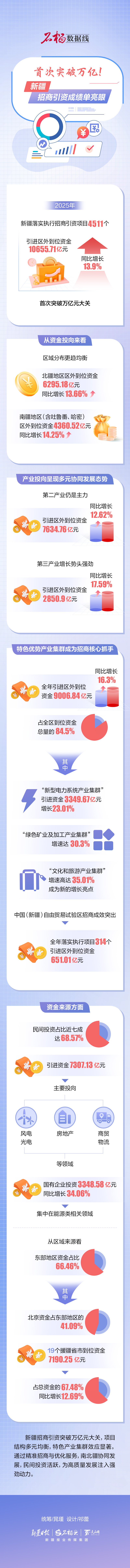 2025年新疆落實(shí)執(zhí)行招商引資項(xiàng)目4511個(gè),引進(jìn)區(qū)外到位資金10655.71億元,同比增長(zhǎng)13.9%,首次突破萬(wàn)億元大關(guān)。