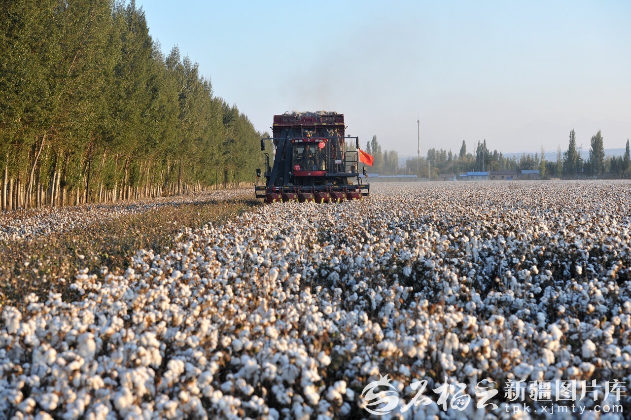 10月4日,彩棉機在沙灣市安集海鎮(zhèn)和平新村棉田里作業(yè)。(資料圖片)