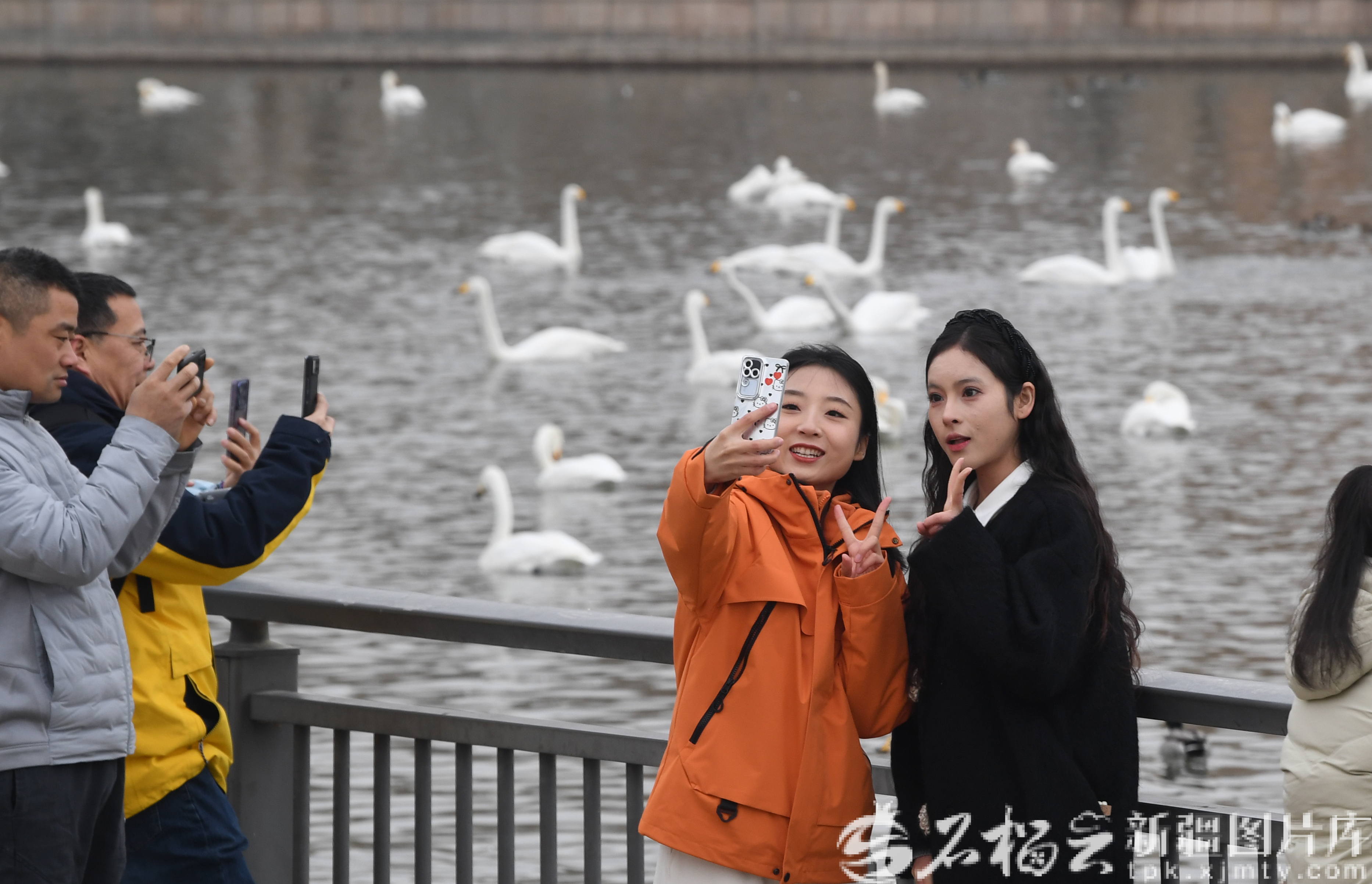1月1日,游客在庫爾勒市杜鵑河上與天鵝合影。
