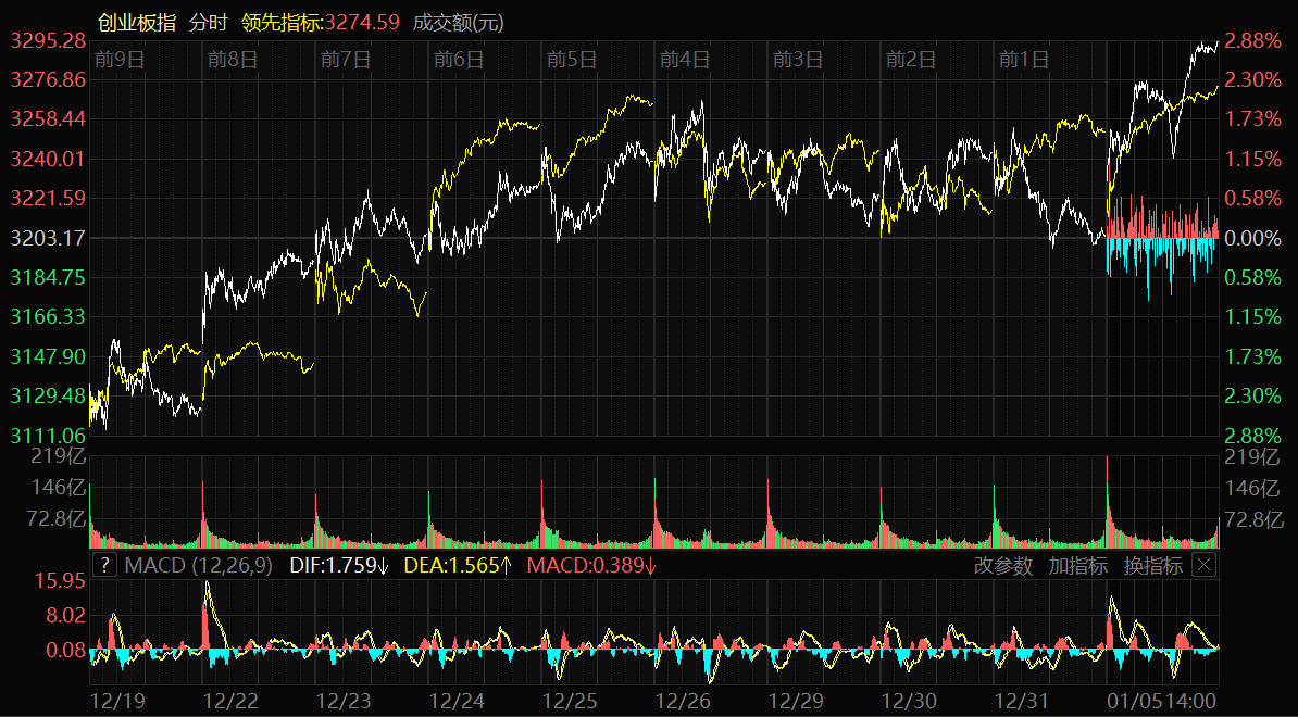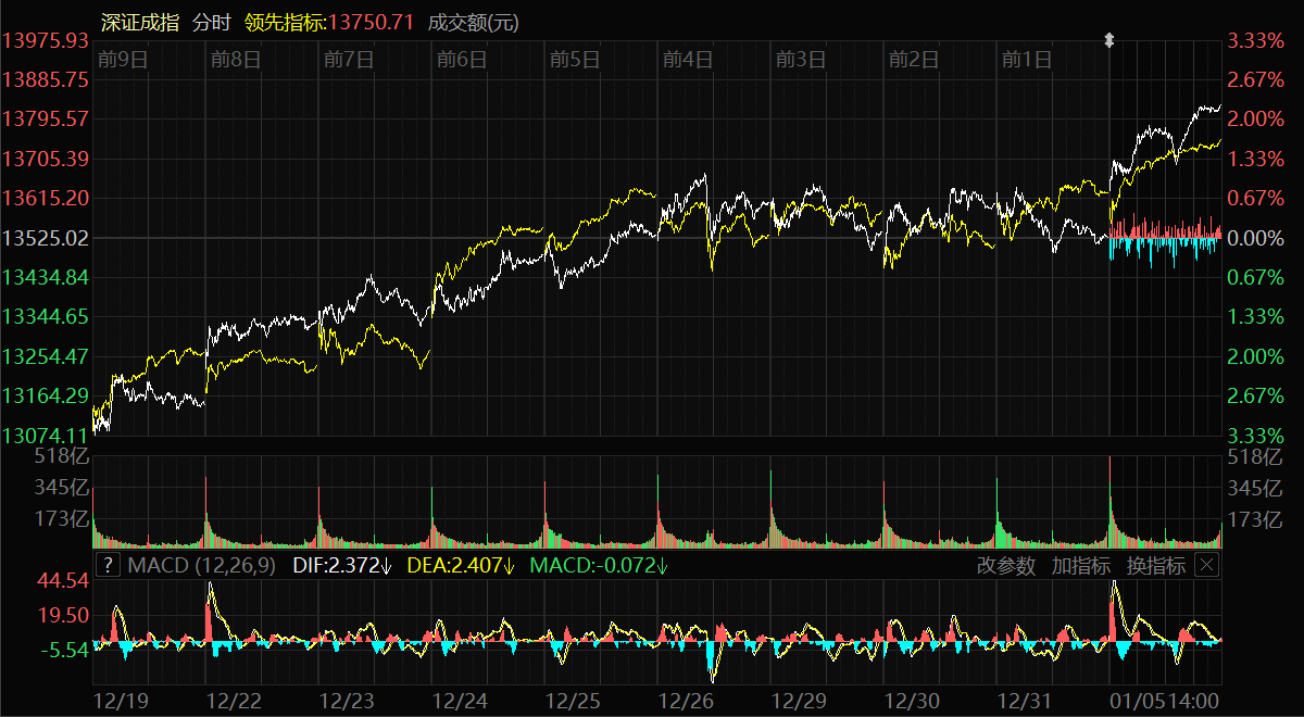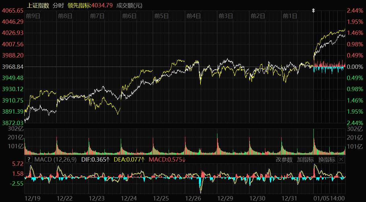 天山網(wǎng)-新疆日報訊(記者冉虎報道)1月5日,A股喜迎2026年開門紅,上證指數(shù)重新站上4000點。截至收盤,上證指數(shù)漲1.38%,報收4023.42點;深證成指漲2.24%,報收13828.63點;創(chuàng)業(yè)板指漲2.85%,報收3294.55點。滬深兩市成交額達25675億元,較2025年12月31日大幅放量5016億元。