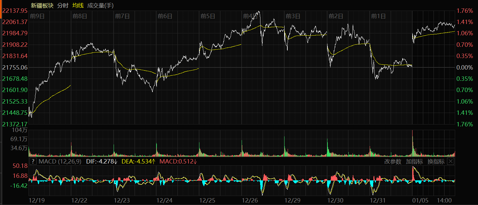 1月5日收盤時,新疆板塊指數(shù)漲1.34%,報收22046.14點,49只股票上漲,12只股票下跌,1只股票平盤,個股上漲比例為79.03%,總換手率2.02%,總成交額316.53億元。