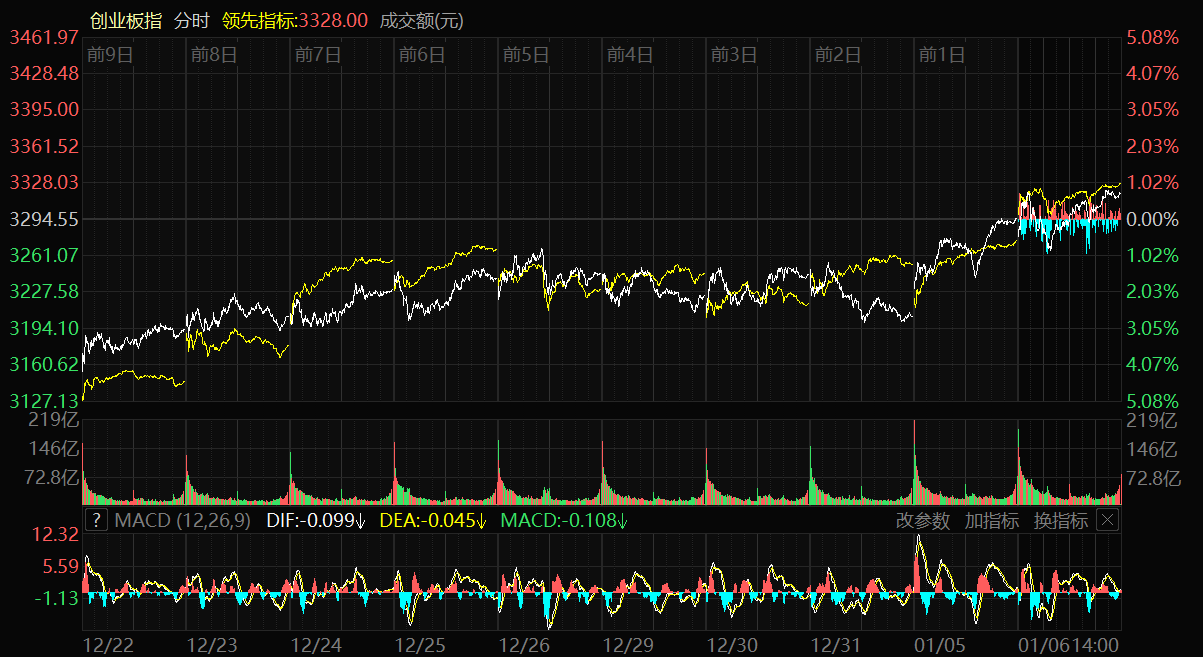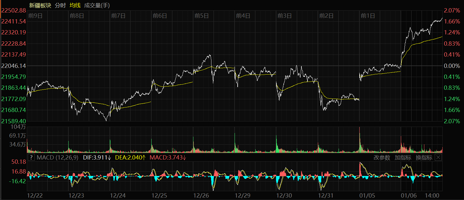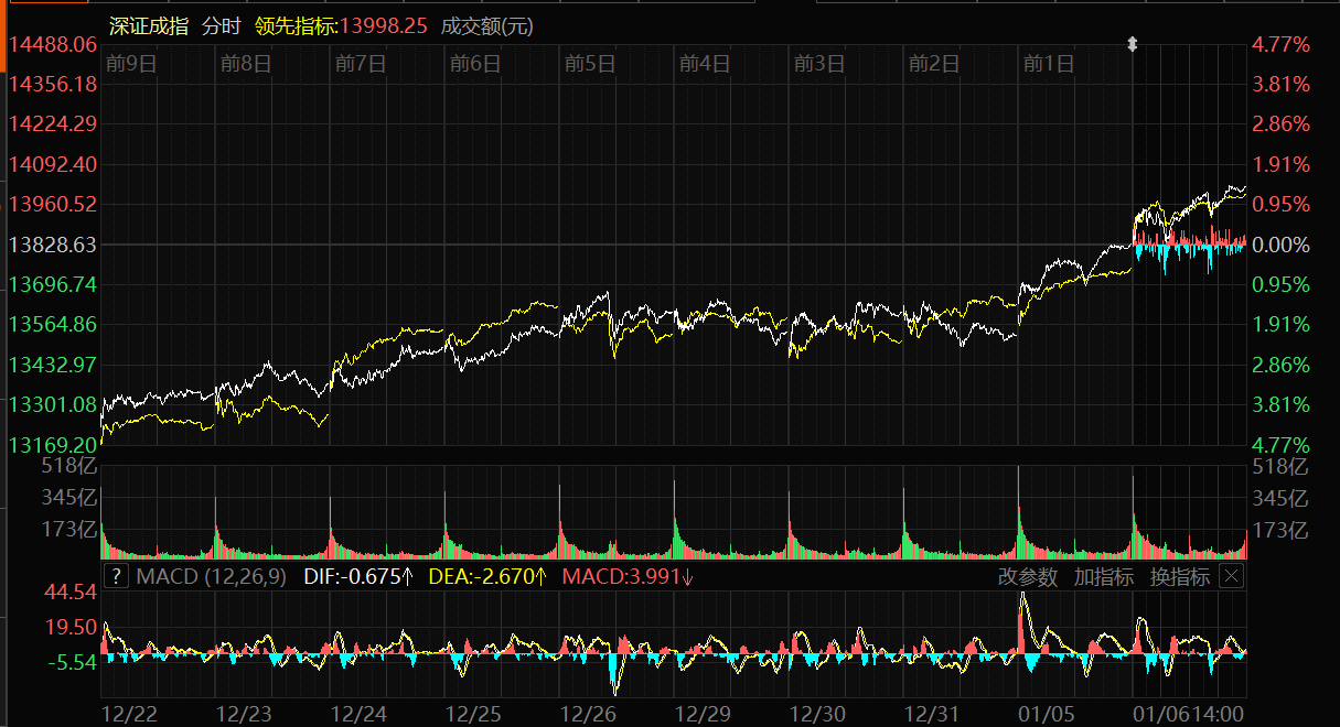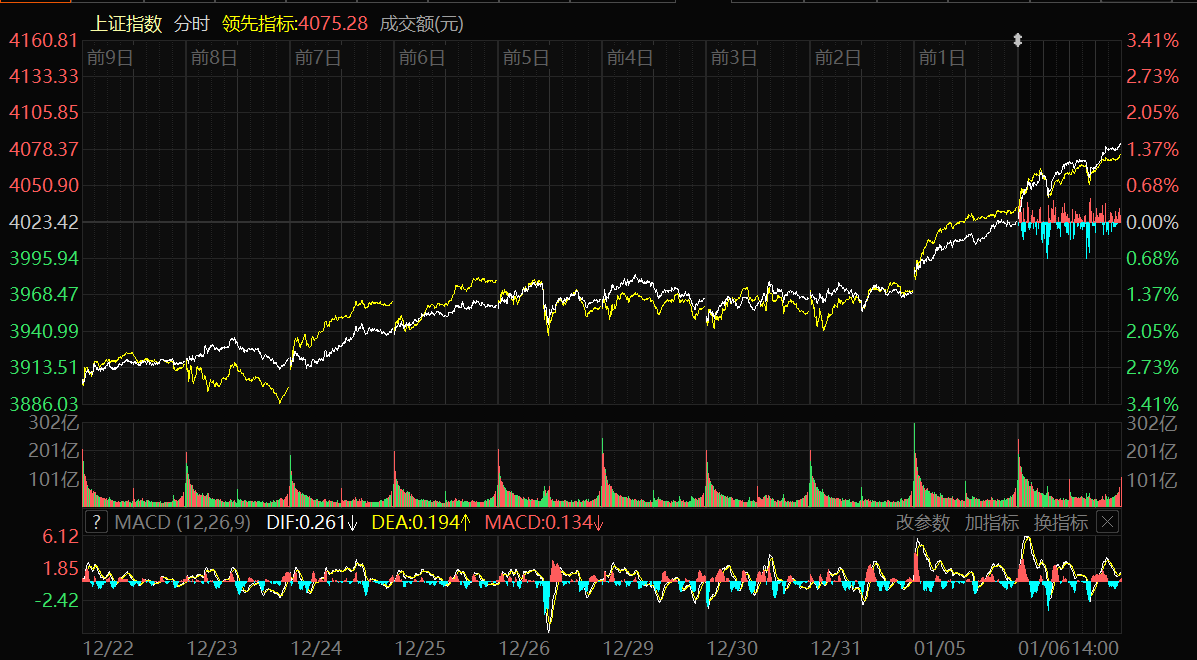 天山網(wǎng)-新疆日?qǐng)?bào)訊(記者冉虎報(bào)道)1月6日,A股三大指數(shù)延續(xù)強(qiáng)勢(shì)上漲,上證指數(shù)日線連續(xù)13天收陽(yáng),創(chuàng)2015年7月以來(lái)的逾十年新高。截至收盤(pán),上證指數(shù)漲1.50%,報(bào)收4083.67點(diǎn);深證成指漲1.40%,報(bào)收14022.55點(diǎn);創(chuàng)業(yè)板指漲0.75%,報(bào)收3319.29點(diǎn)。滬深兩市成交額達(dá)28326億元,較昨日放量2651億元。