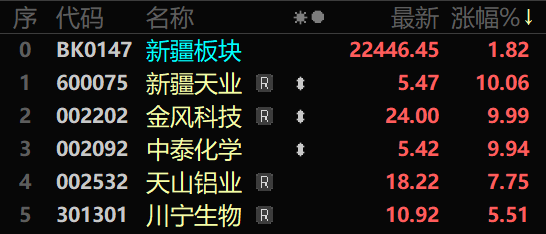 其中,新疆天業(yè)上漲10.06%,報(bào)收5.47元;金風(fēng)科技上漲9.99%,報(bào)收24.00元;中泰化學(xué)上漲9.94%,報(bào)收5.42元;天山鋁業(yè)上漲7.75%,報(bào)收18.22元;川寧生物上漲5.51%,報(bào)收10.92元。統(tǒng)一股份、*ST新研、萬(wàn)憬能源、中信尼雅、國(guó)統(tǒng)股份跌幅居前。