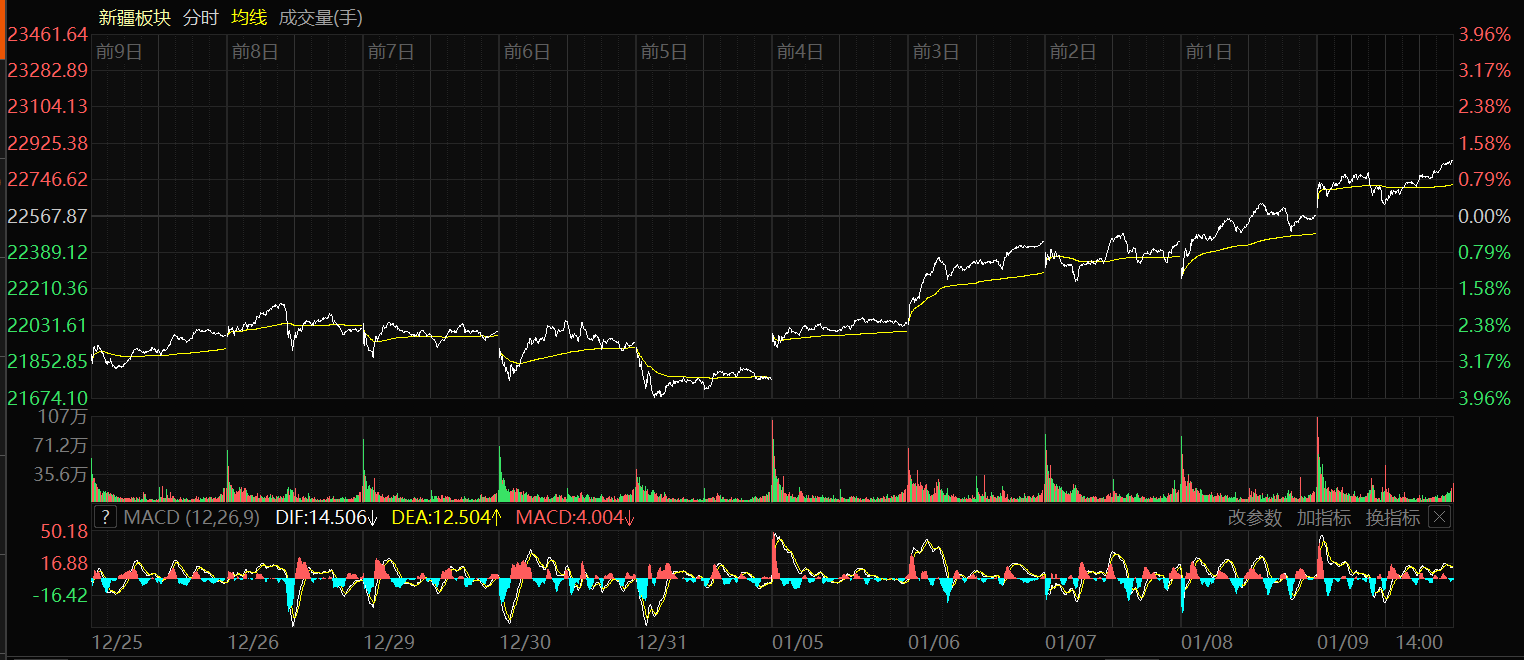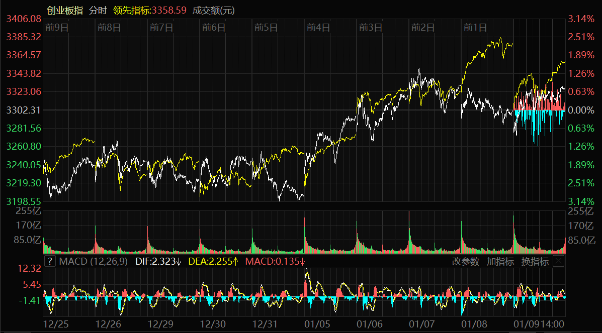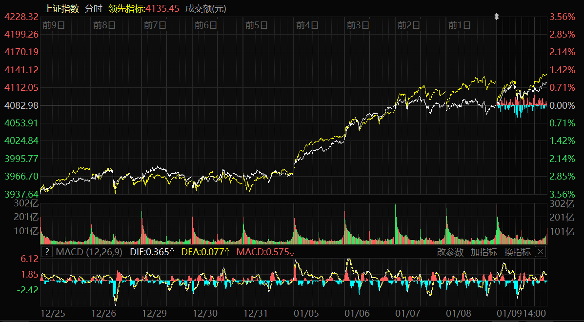 天山網(wǎng)-新疆日報訊(記者冉虎報道)1月9日,A股三大指數(shù)延續(xù)上攻步伐。上證指數(shù)日線收出16連陽,站上4100點,再創(chuàng)逾10年新高。截至收盤,上證指數(shù)漲0.92%,報收4120.43點;深證成指漲1.15%,報收14120.15點;創(chuàng)業(yè)板指漲0.77%,報收3327.81點。滬深兩市成交額突破三萬億元,達到31526億元,較昨日放量3261億元。