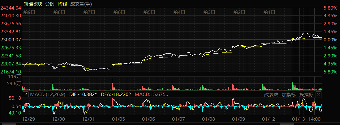 1月13日收盤時,新疆板塊指數(shù)漲0.25%,報收23067.44點,22只股票上漲,39只股票下跌,1只股票平盤,個股上漲比例為35.48%,總換手率3.22%,總成交額621.82億元。
