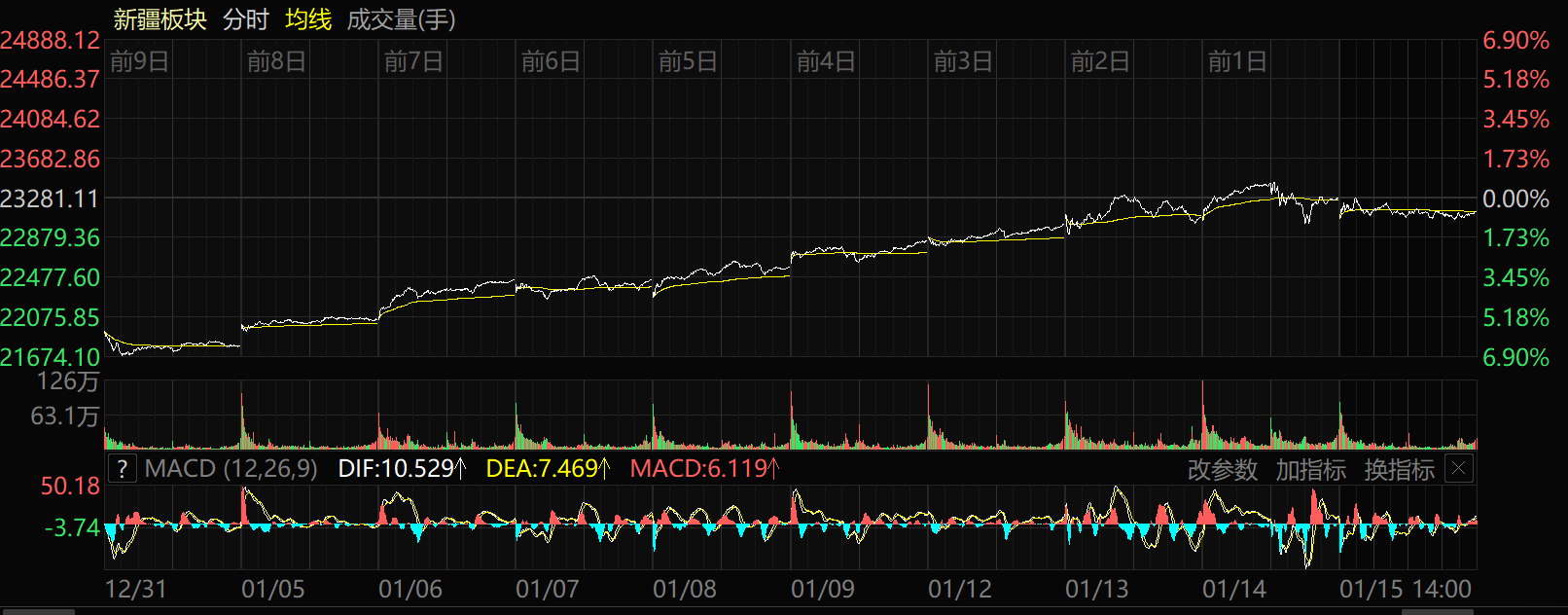 1月15日收盤時,新疆板塊指數(shù)跌0.59%,報收23144.28點,23只股票上漲,35只股票下跌,4只股票平盤,個股上漲比例為37.10%,總換手率2.36%,總成交額394.57億元。