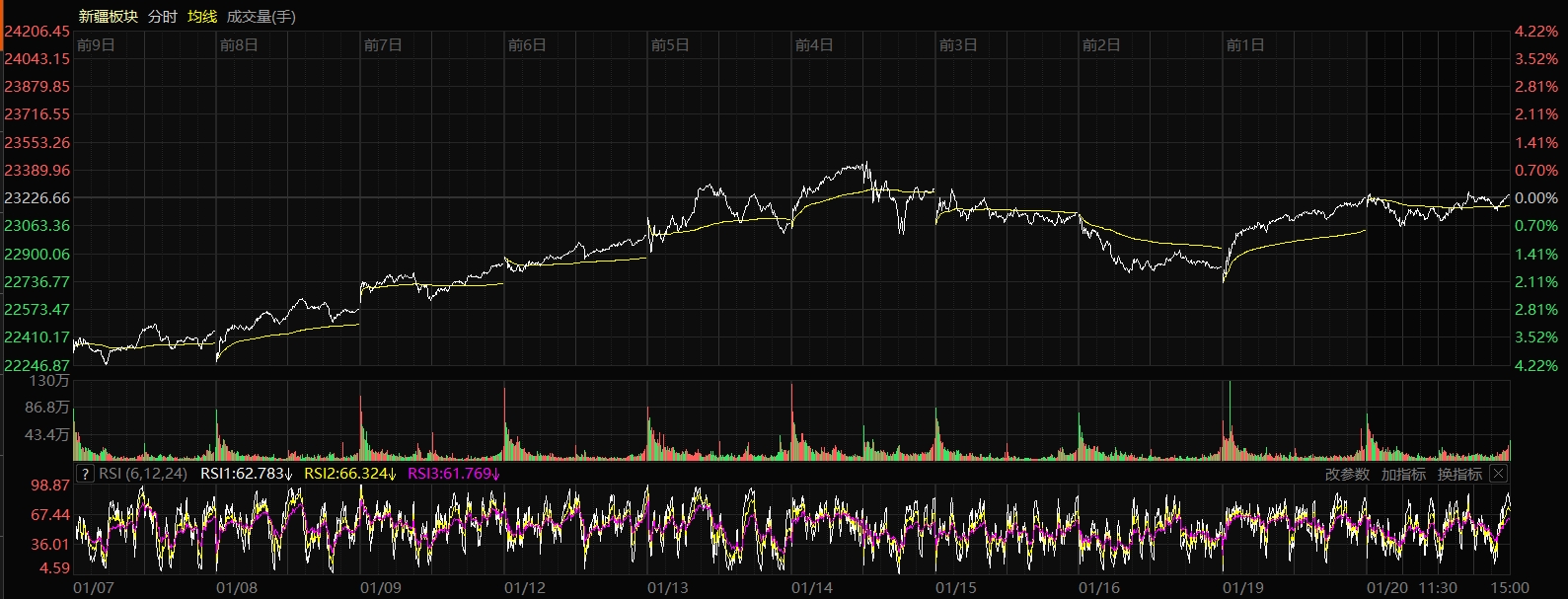 1月20日收盤時,新疆板塊指數(shù)漲0.06%,報收23241.08點,32只股票上漲,28只股票下跌,2只股票平盤,個股上漲比例為51.61%,總換手率2.82%,總成交額551.80億元。