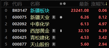 今日,新疆天業(yè)上漲8.12%,報收6.26元;中泰化學上漲4.97%,報收6.13元;西部黃金上漲4.39%,報收32.10元;青松建化上漲3.42%,報收4.53元;天山股份上漲2.94%,報收5.60元。金風科技、科力股份、天順股份、大全能源、統(tǒng)一股份跌幅居前。