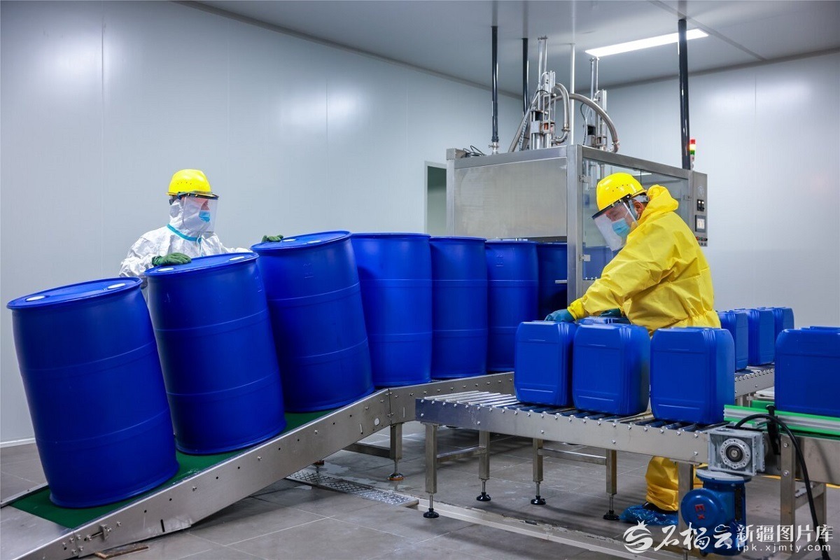 1月16日,在新疆昌吉回族自治州呼圖壁縣新疆聚利信德生物藥業(yè)有限公司的全自動(dòng)生產(chǎn)車(chē)間內(nèi),技術(shù)人員正在操控設(shè)備趕制一批獸用消毒劑產(chǎn)品。馬光元攝