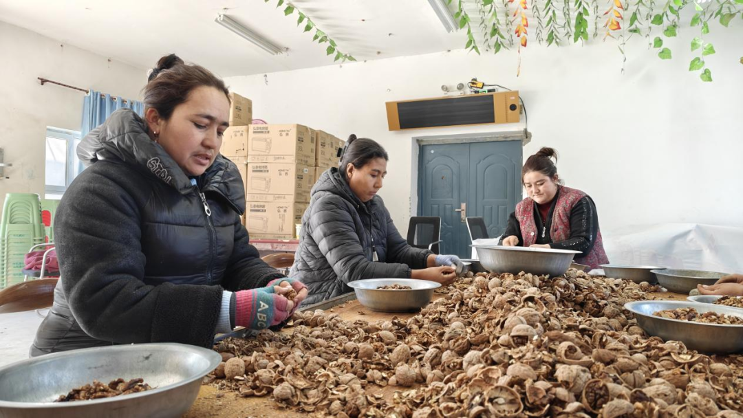 1月19日,在罕艾日克鎮(zhèn)吉格代艾日克村的核桃加工廠里,村民們圍坐一起,熟練地為核桃去殼,飽滿的核桃仁很快堆滿籃筐。該村積極引進核桃加工廠,為年齡偏大、需照顧家庭、不便外出務工的村民搭建起便捷的就業(yè)平臺。工廠目前吸納了本村30多名村民就近就業(yè)。