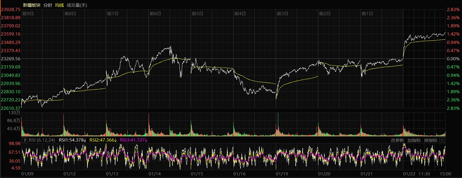 1月22日收盤時,新疆板塊指數(shù)漲1.51%,報收23620.27點(diǎn),50只股票上漲,10只股票下跌,2只股票平盤,個股上漲比例為80.65%,總換手率2.57%,總成交額416.69億元。