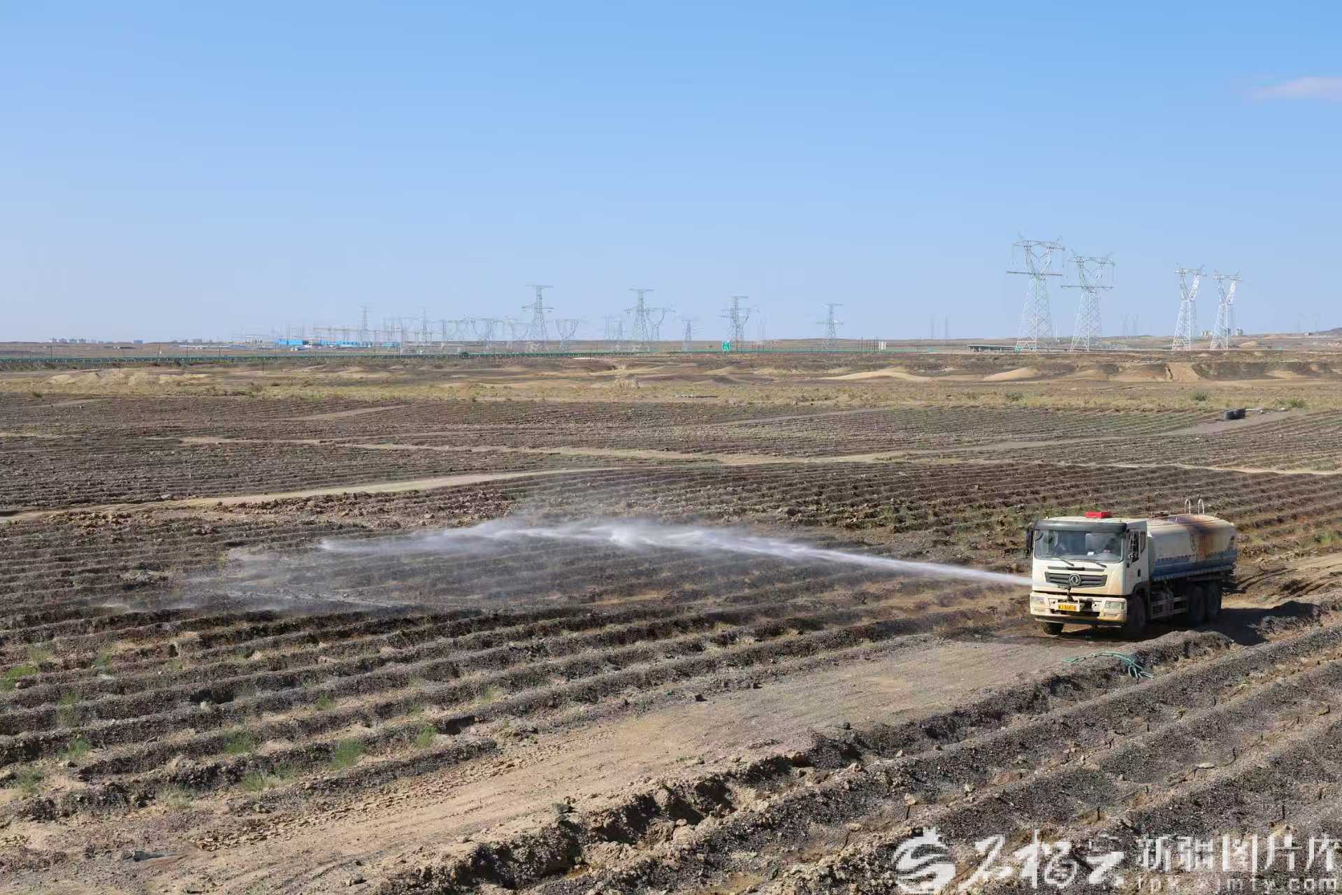 2025年4月,準噶爾盆地西緣(克拉瑪依市)歷史遺留廢棄礦山生態(tài)修復(fù)示范工程1—4號子項目現(xiàn)場,工作人員在養(yǎng)護澆水。居西坤·亞力坤 攝
