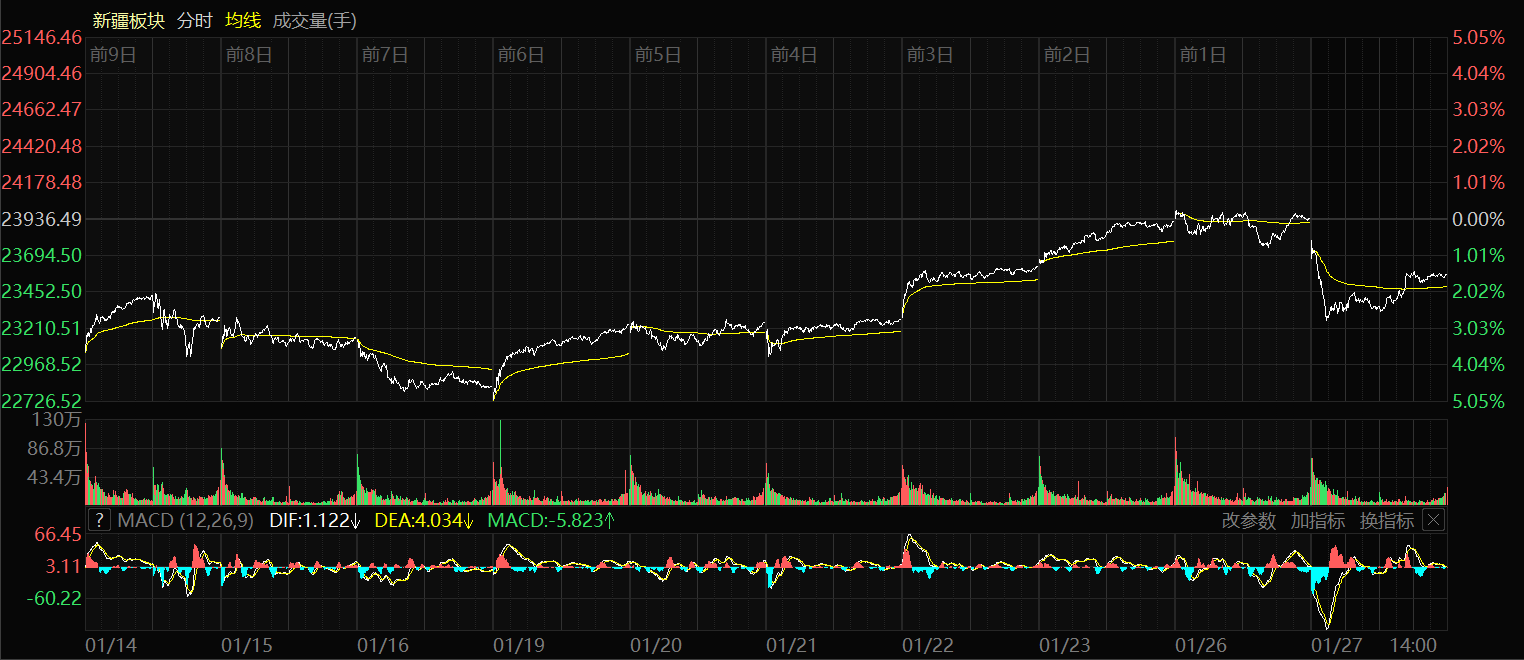 1月27日收盤時,新疆板塊指數(shù)跌1.55%,報收23565.30點(diǎn),7只股票上漲,55只股票下跌,個股上漲比例為11.29%,總換手率2.67%,總成交額416.84億元。