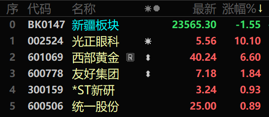 今日,光正眼科上漲10.10%,報收5.56元;西部黃金上漲6.60%,報收40.24元;友好集團(tuán)上漲1.84%,報收7.18元;*ST新研上漲0.93%,報收3.24元;統(tǒng)一股份上漲0.89%,報收25.00元。八一鋼鐵、新農(nóng)開發(fā)、*ST天山、天富能源、科力股份跌幅居前。
