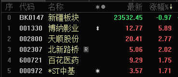 今日,博納影業(yè)上漲5.89%,報收12.77元;天順股份上漲2.77%,報收20.41元;北新路橋上漲2.02%,報收5.06元;百花醫(yī)藥上漲1.75%,報收9.29元;*ST中基上漲1.71%,報收3.57元。卓郎智能、天山鋁業(yè)、中油工程、新疆眾和、寶地礦業(yè)跌幅居前。