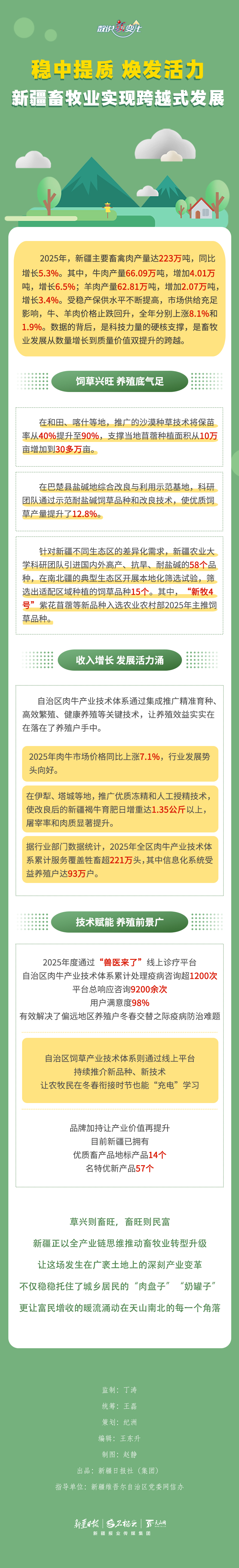 2025年,新疆深入實(shí)施畜牧業(yè)振興行動(dòng),“牧九條”等政策成效持續(xù)顯現(xiàn),畜牧業(yè)生產(chǎn)企穩(wěn)回升、再攀新高,主要畜禽肉產(chǎn)量達(dá)223萬(wàn)噸,同比增長(zhǎng)5.3%。數(shù)據(jù)的背后,新疆畜牧業(yè)發(fā)展的硬核支撐是什么?今天的《數(shù)說(shuō)“新”變化》一起來(lái)看看。