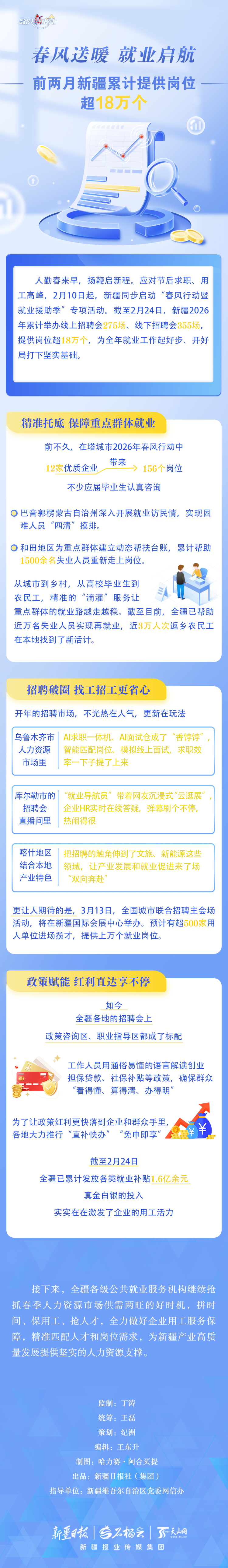 人勤春來早,揚(yáng)鞭啟新程。截至2月24日,新疆2026年累計(jì)舉辦線上招聘會(huì)275場、線下招聘會(huì)355場,提供崗位超18萬個(gè),為全年就業(yè)工作起好步、開好局打下堅(jiān)實(shí)基礎(chǔ)。就業(yè)是民生之本,新疆各級(jí)公共就業(yè)服務(wù)機(jī)構(gòu)在保用工、引人才方面做了哪些努力?今天的《數(shù)說“新”變化》一起來看看。