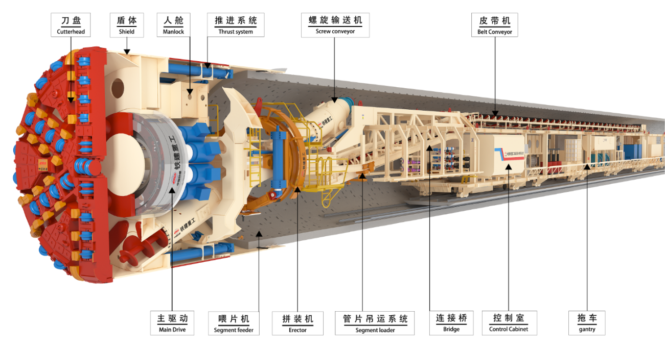 盾構(gòu)機(jī)由刀盤、盾體、人艙、出渣系統(tǒng)、管片拼裝機(jī)、后配套、液壓流體系統(tǒng)、電氣系統(tǒng)、導(dǎo)向系統(tǒng)等組成,它猶如一條“鋼鐵穿山甲”。的確,盾構(gòu)機(jī)的工作原理類似于“穿山甲”挖洞:盾構(gòu)機(jī)的刀盤和刀具是“穿山甲”的前爪,用來破土和掘進(jìn);盾體是“穿山甲”的背部,用來支護(hù)已經(jīng)挖掘成形的隧道;出渣系統(tǒng)是“穿山甲”的后爪,負(fù)責(zé)把挖掘處的渣土搬運(yùn)到洞口外;管片拼裝機(jī)所拼裝的管片是前進(jìn)時(shí)“穿山甲”的閉合的鱗片,用來加固隧道,讓挖出的洞更堅(jiān)固;控制室是“穿山甲”的大腦,電氣系統(tǒng)是“穿山甲”的神經(jīng),液壓泵站是“穿山甲”的心臟,液壓流體系統(tǒng)是“穿山甲”的血管,導(dǎo)向系統(tǒng)是“穿山甲”的雙眼。