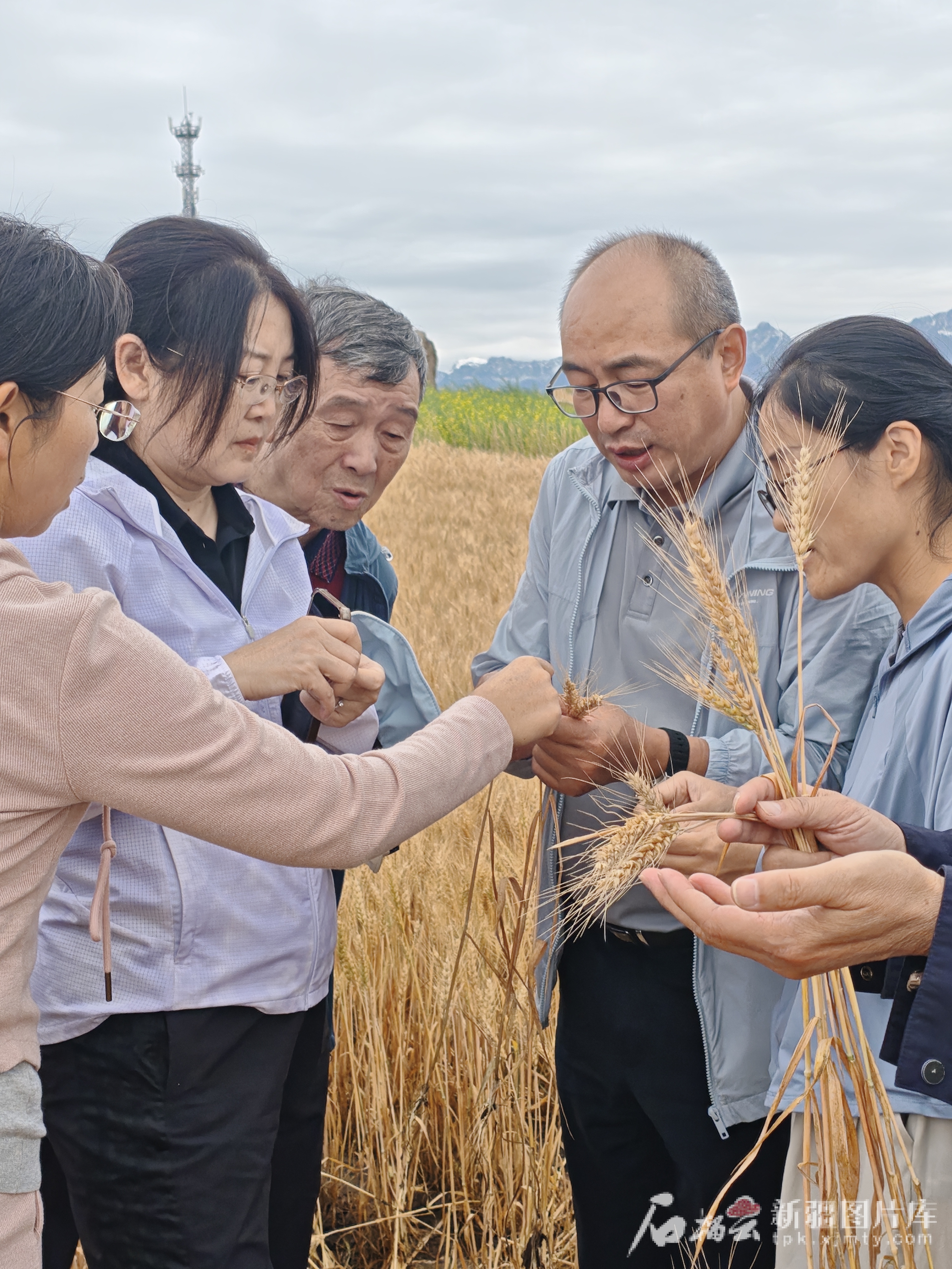 與會(huì)專家在奇臺(tái)縣現(xiàn)場(chǎng)調(diào)研小麥防干熱風(fēng)增粒重技術(shù)。圖/新疆農(nóng)業(yè)氣象臺(tái)提供