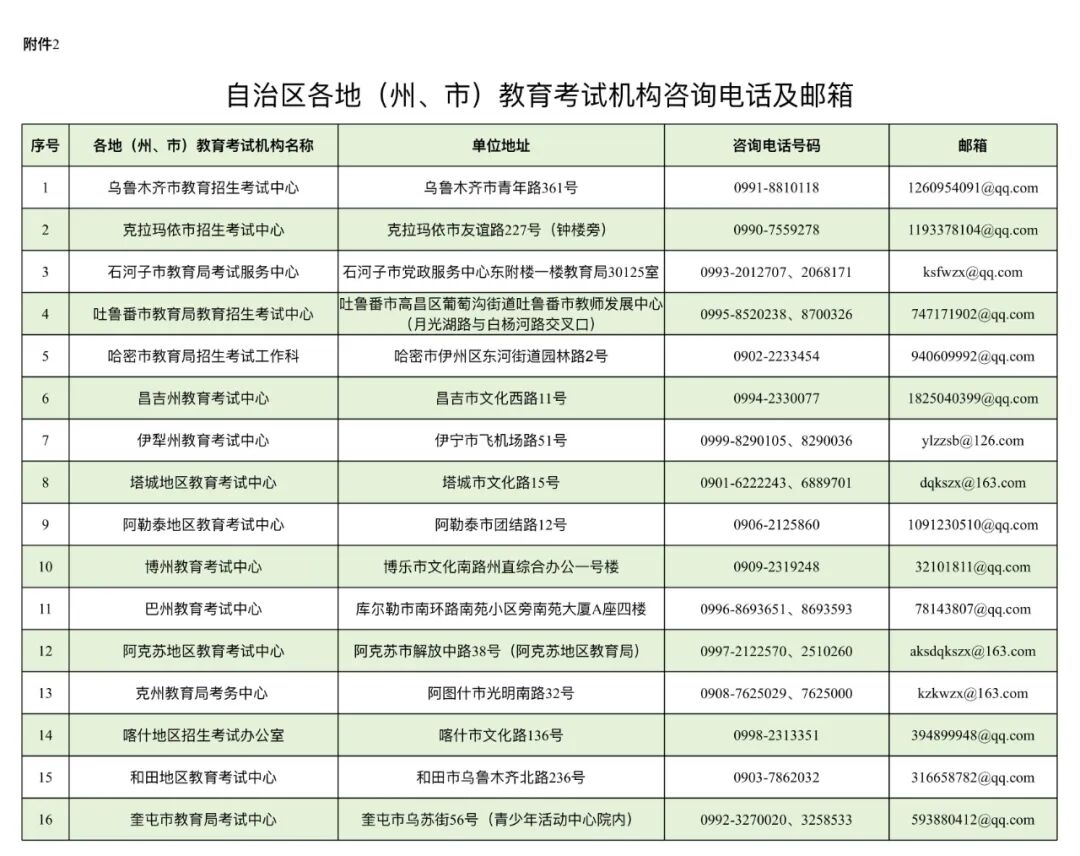附:自治區(qū)各地(州、市)教育考試機構(gòu)咨詢電話及郵箱