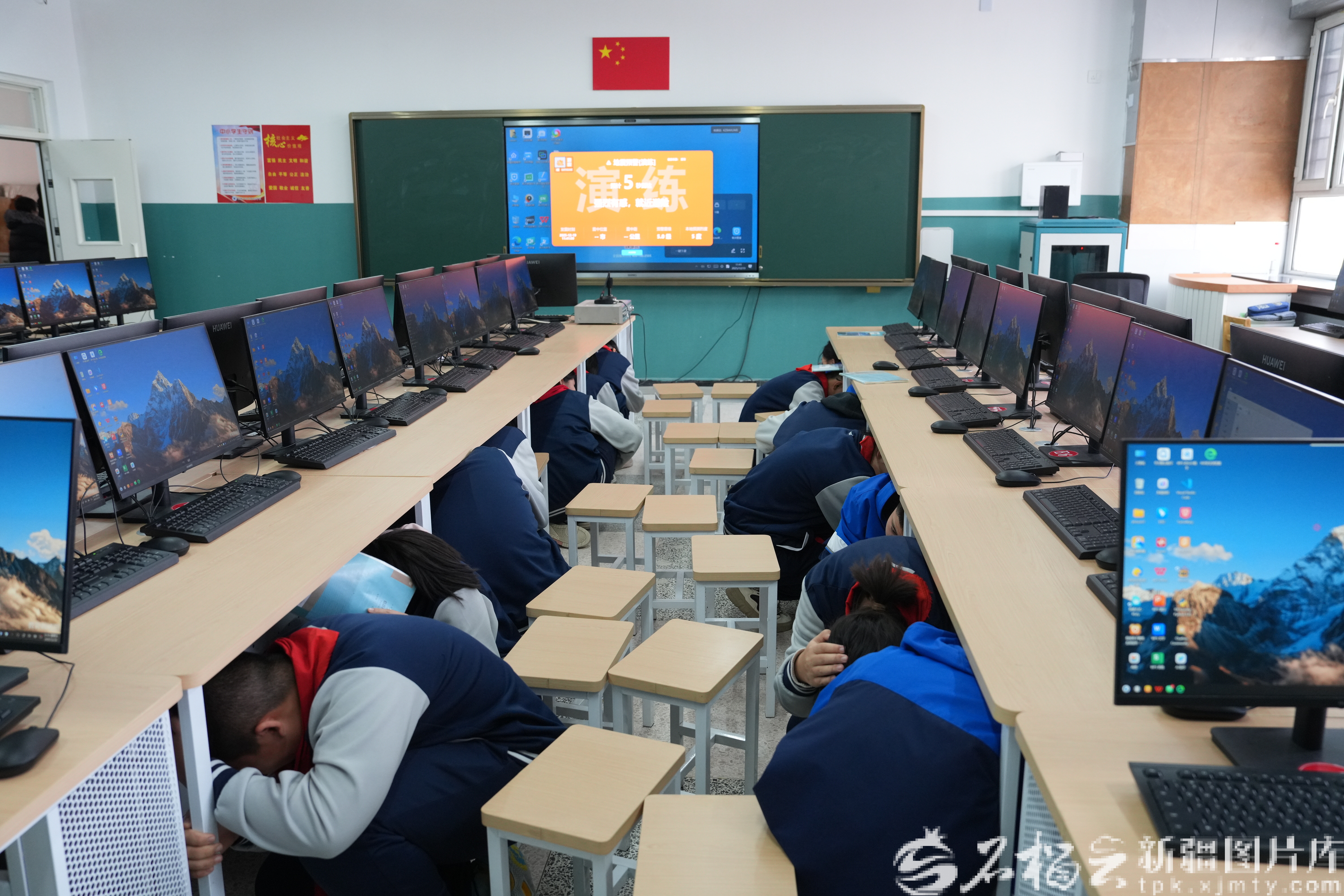 12月19日,在烏魯木齊市實驗學校測試現(xiàn)場,孩子們模擬地震安全演練。自治區(qū)地震局供圖