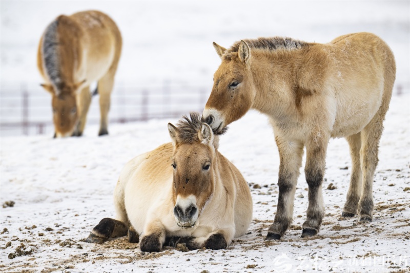 12月18日,新疆卡拉麥里山有蹄類(lèi)野生動(dòng)物自然保護(hù)區(qū)喬木西拜普氏野馬監(jiān)測(cè)站,普氏野馬在雪地里棲息。何龍攝