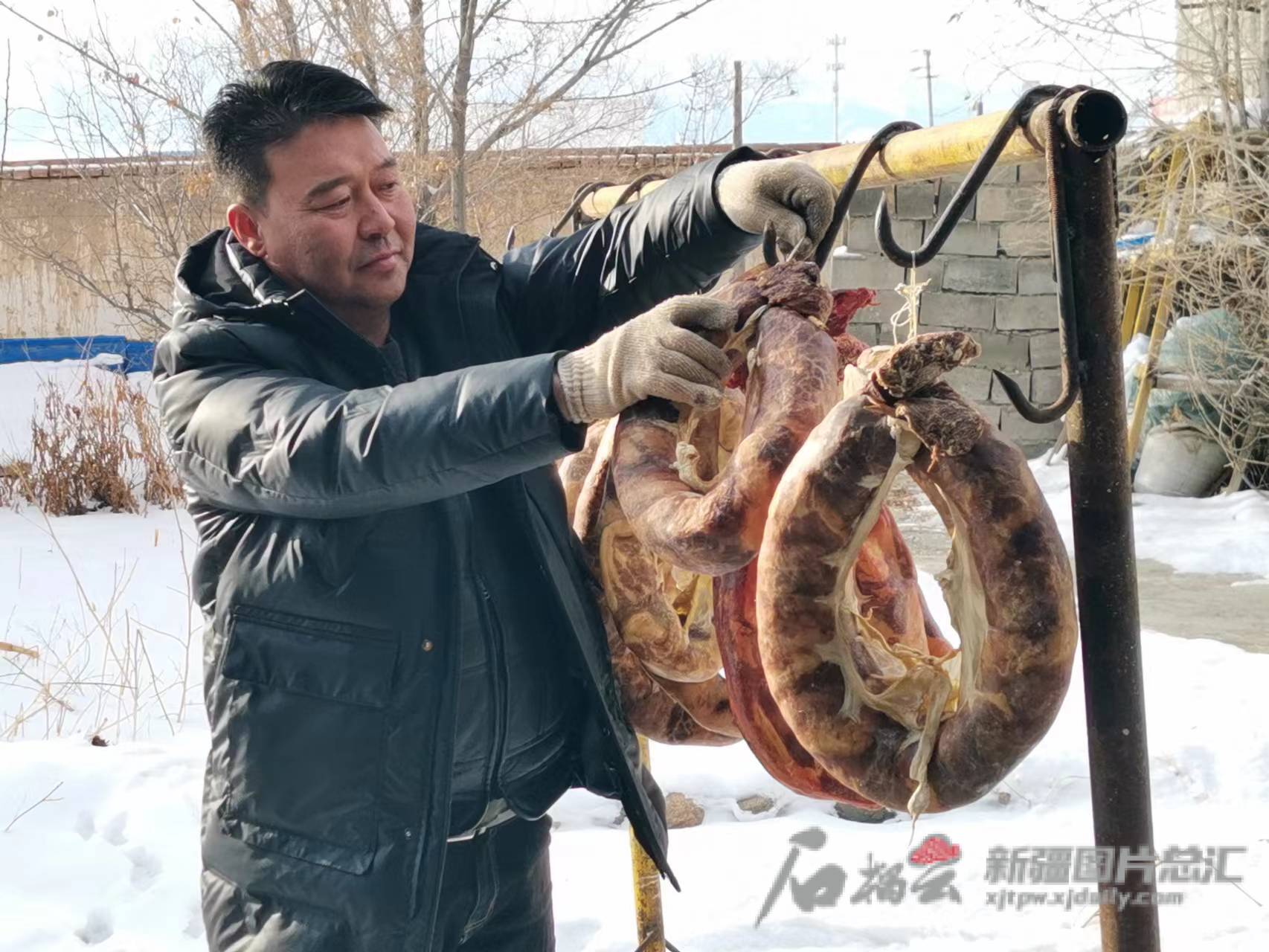 2022年12月31日,別克·爾斯汗在庭院中整理加工晾曬好的馬腸子。天山網(wǎng)-新疆日?qǐng)?bào)記者 魏永貴攝