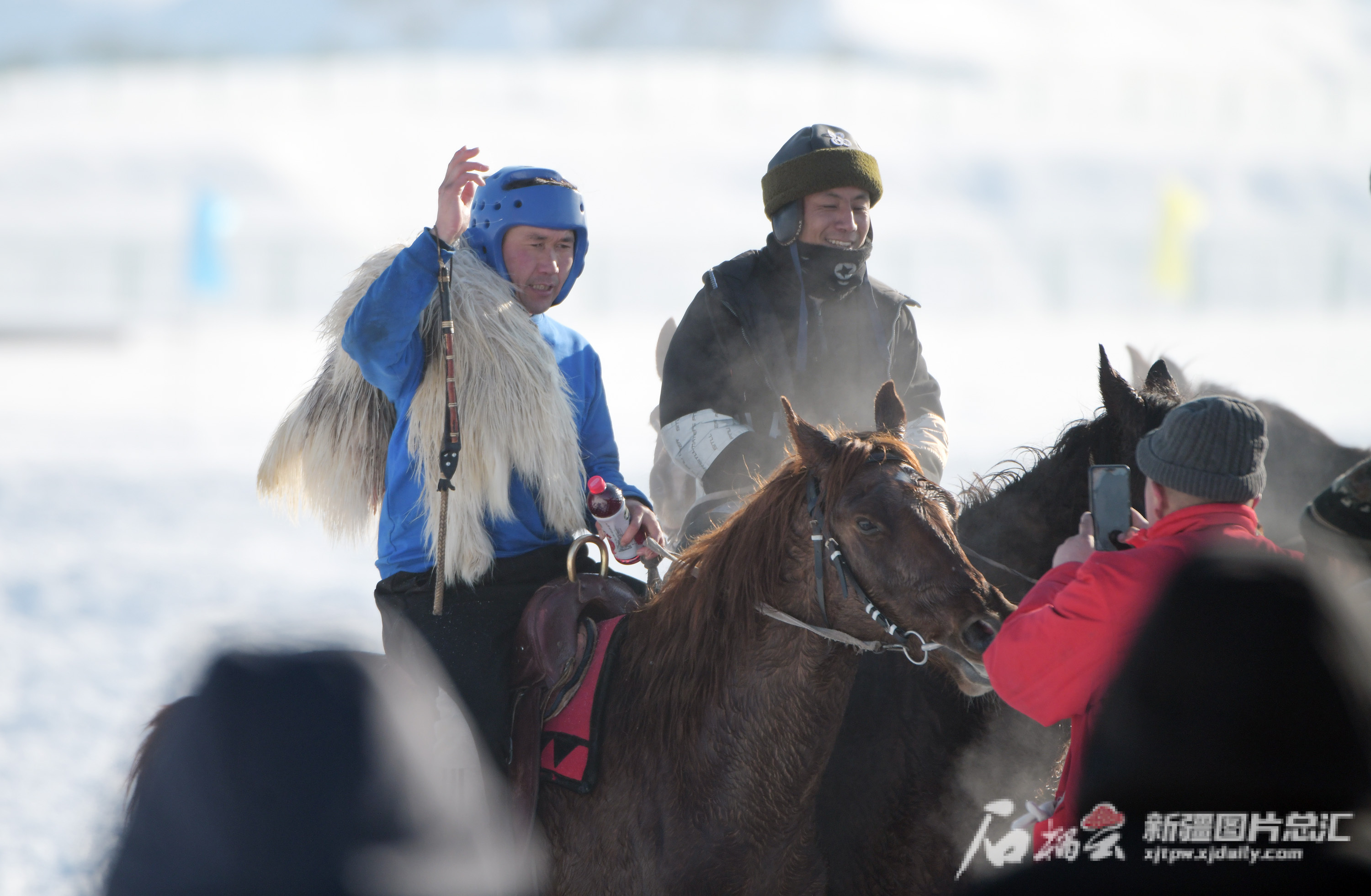 1月3日 ,水磨溝區(qū)首屆刁羊比賽冠軍獲得者吉木薩爾隊(duì)隊(duì)員向觀眾招手致意。